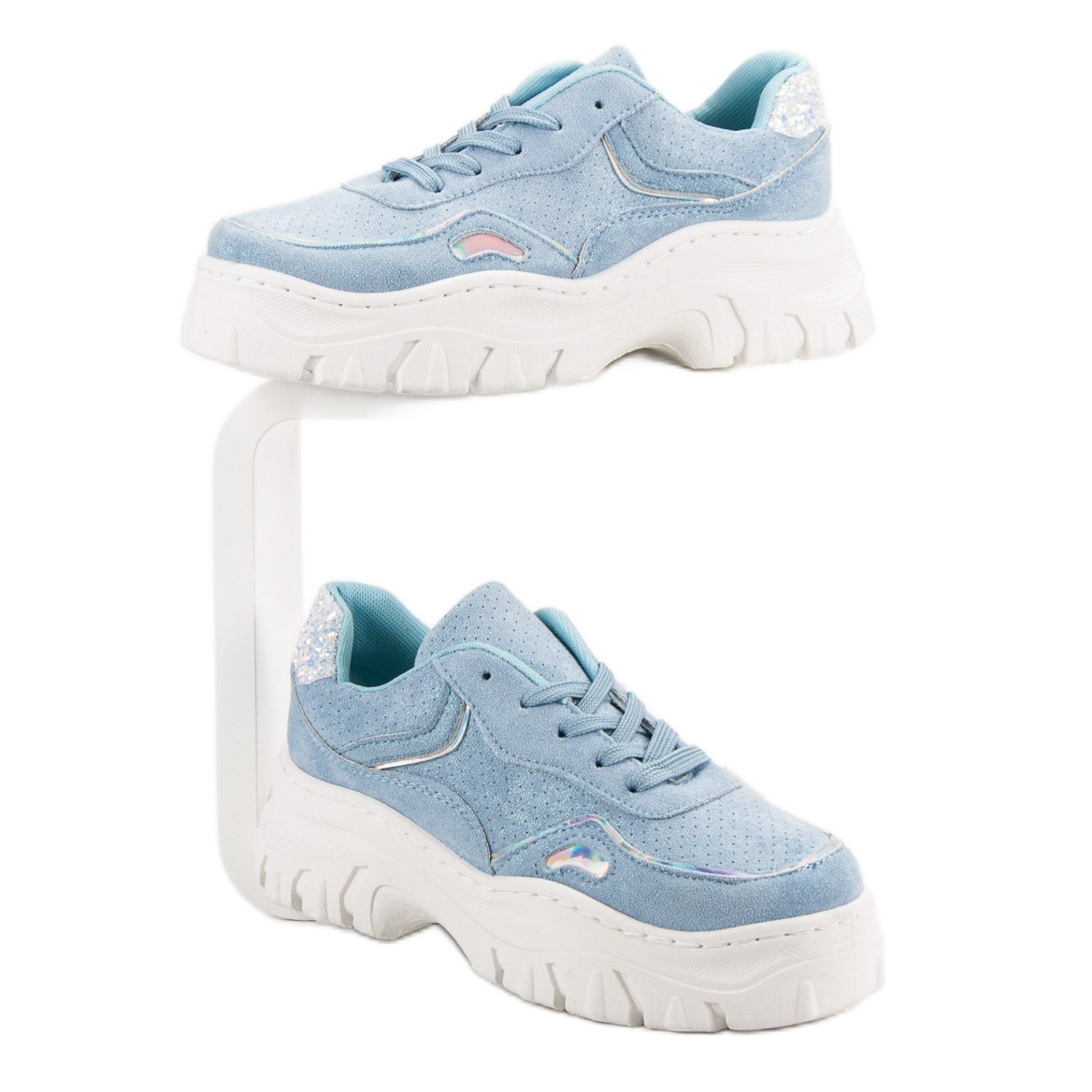 Les baskets bleues à la mode sont un choix parfait pour les femmes qui souhaitent allier confort et look à la mode. Ces chaussures bleues avec une plateforme blanche mi-hauteur présentent une nuance de bleu unique qui ne manquera pas d'attirer l'attention. De subtils inserts brillants et pailletés leur ajoutent du caractère, ce qui en fait un complément parfait aux styles sportifs en toute occasion.