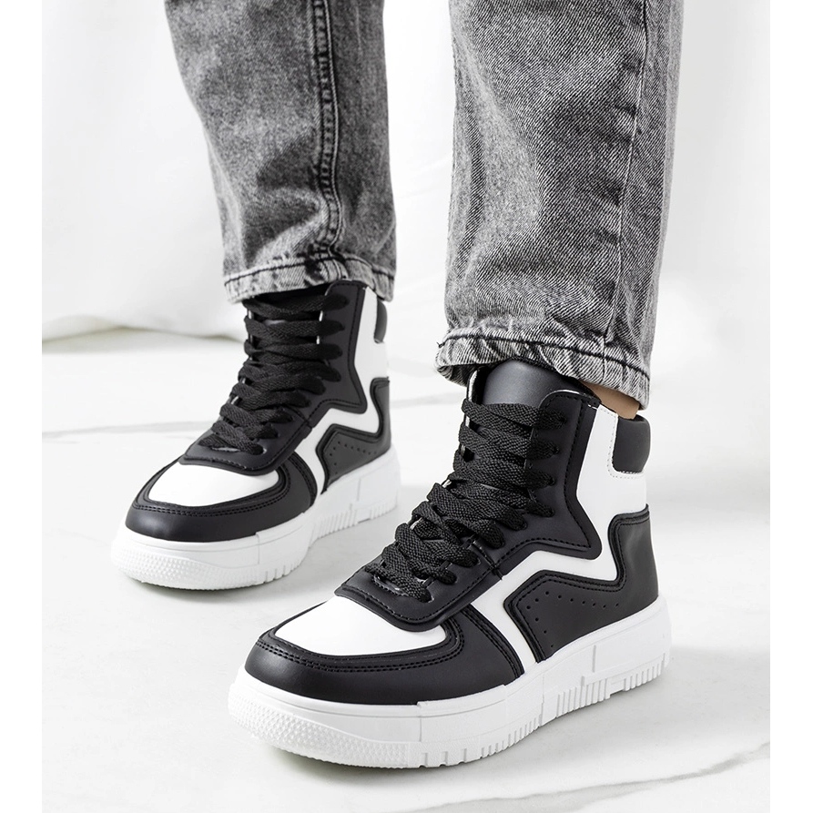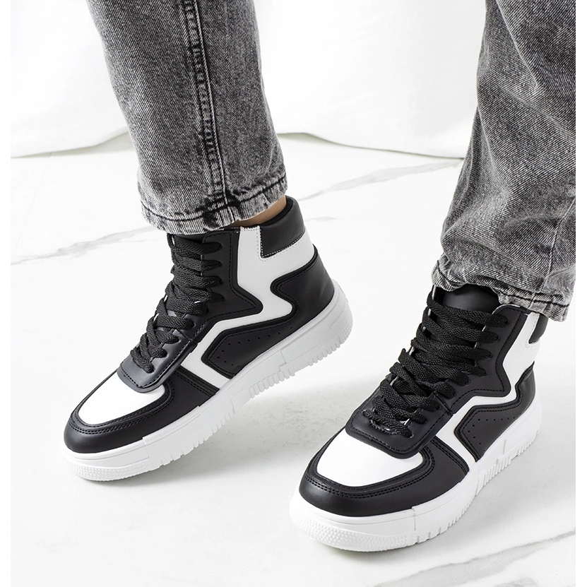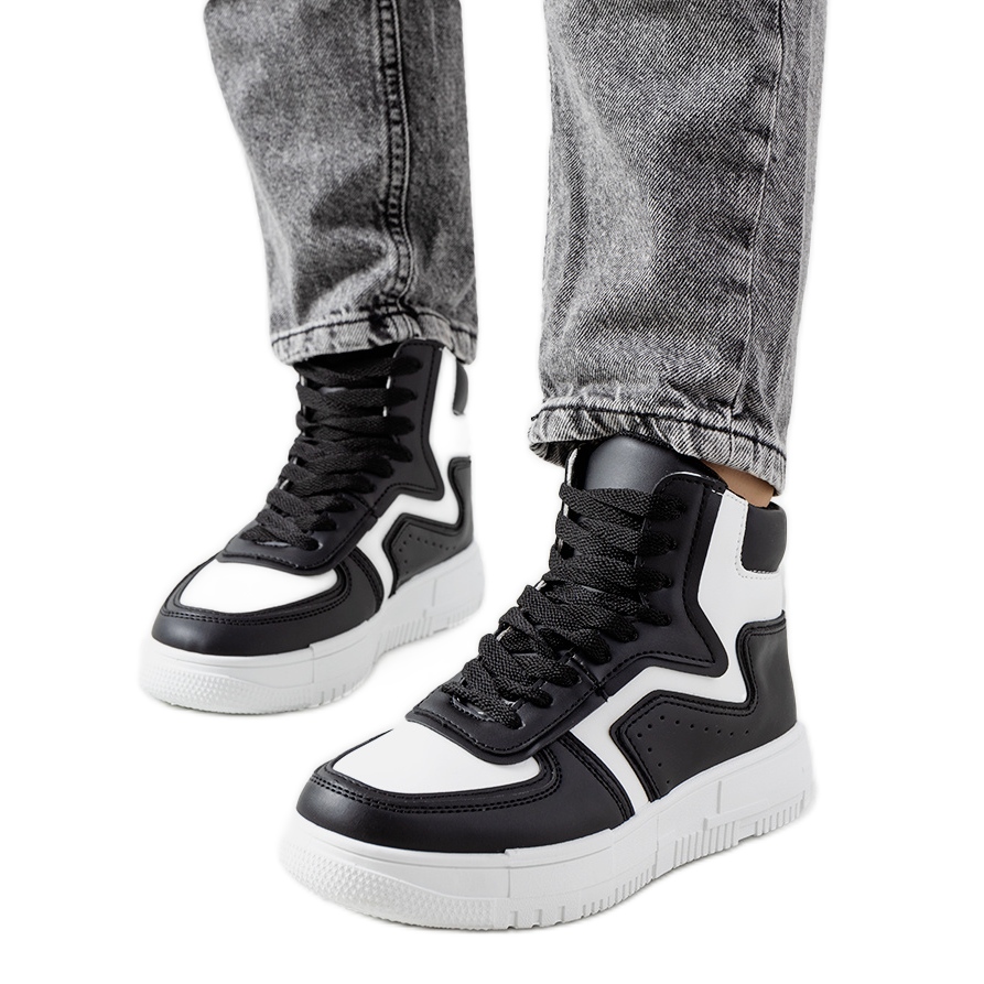 Sneakers Black Roseda - Élégant, confortable et universel. La coupe haute complétera parfaitement des stylisations décontractées et plus urbaines et féminines. La semelle blanche et plus épaisse (environ 3 cm) donne aux chaussures un caractère à la mode et allonge optiquement les jambes, et les performances du cuir écologique garantissent le confort toute la journée.