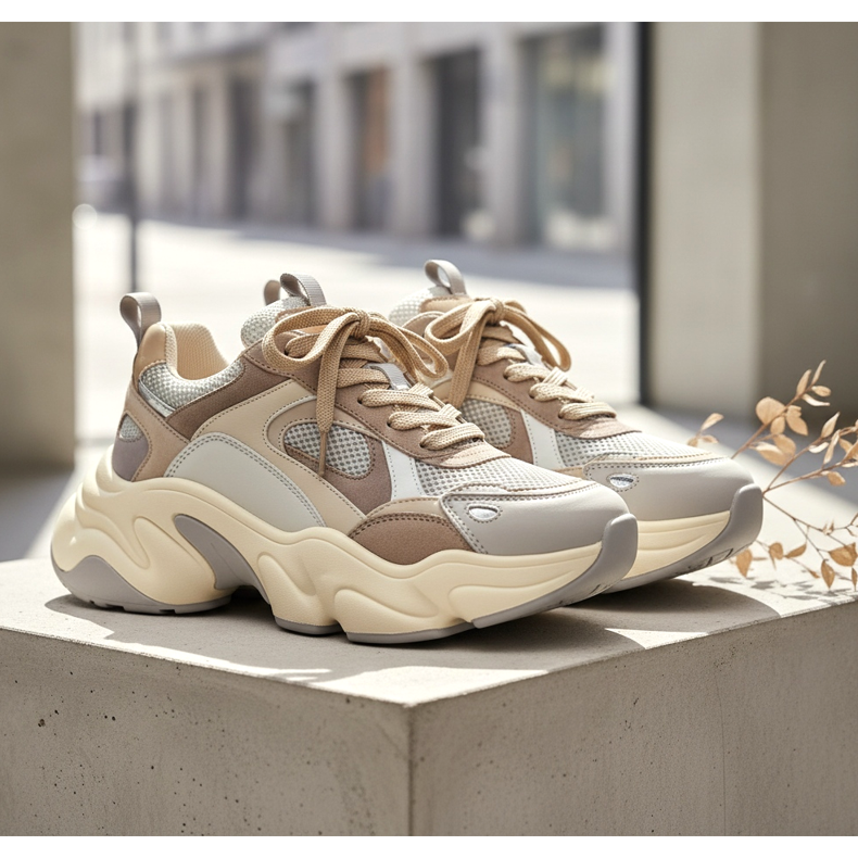 Pour la saison printemps/été 2026, les sneakers chunky évoluent vers des formes plus légères et plus organiques. Les créateurs se concentrent sur des semelles asymétriques, des matériaux contrastés (combinant du cuir avec de la maille et du daim) et des palettes de couleurs sobres - du beige crème au gris pastel.