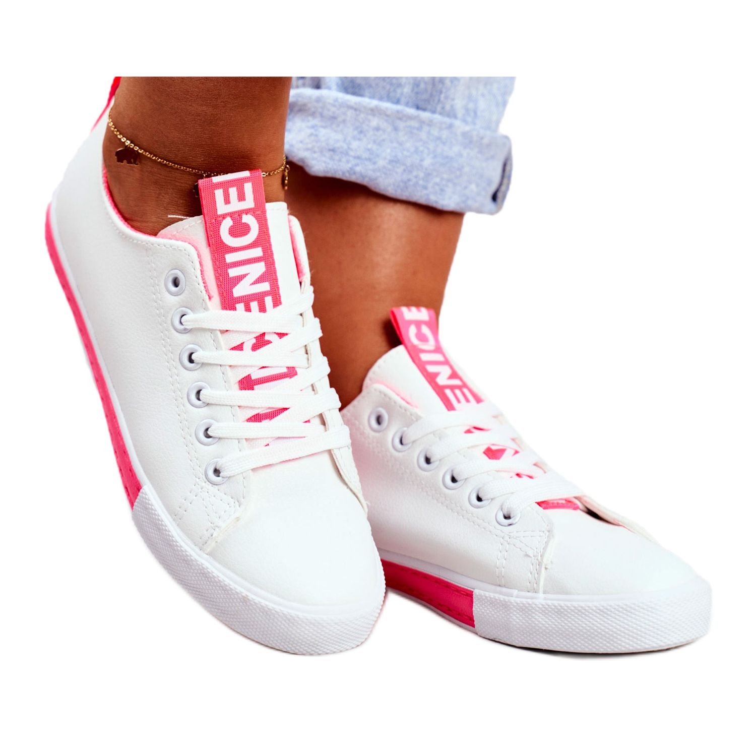 Les baskets se distinguent par un détail unique : une décoration sur le talon et la languette en forme d'inscription « NICE », qui leur ajoute caractère et modernité. Fabriqués en cuir écologique de haute qualité, ils sont non seulement esthétiques, mais également respectueux de l'environnement.