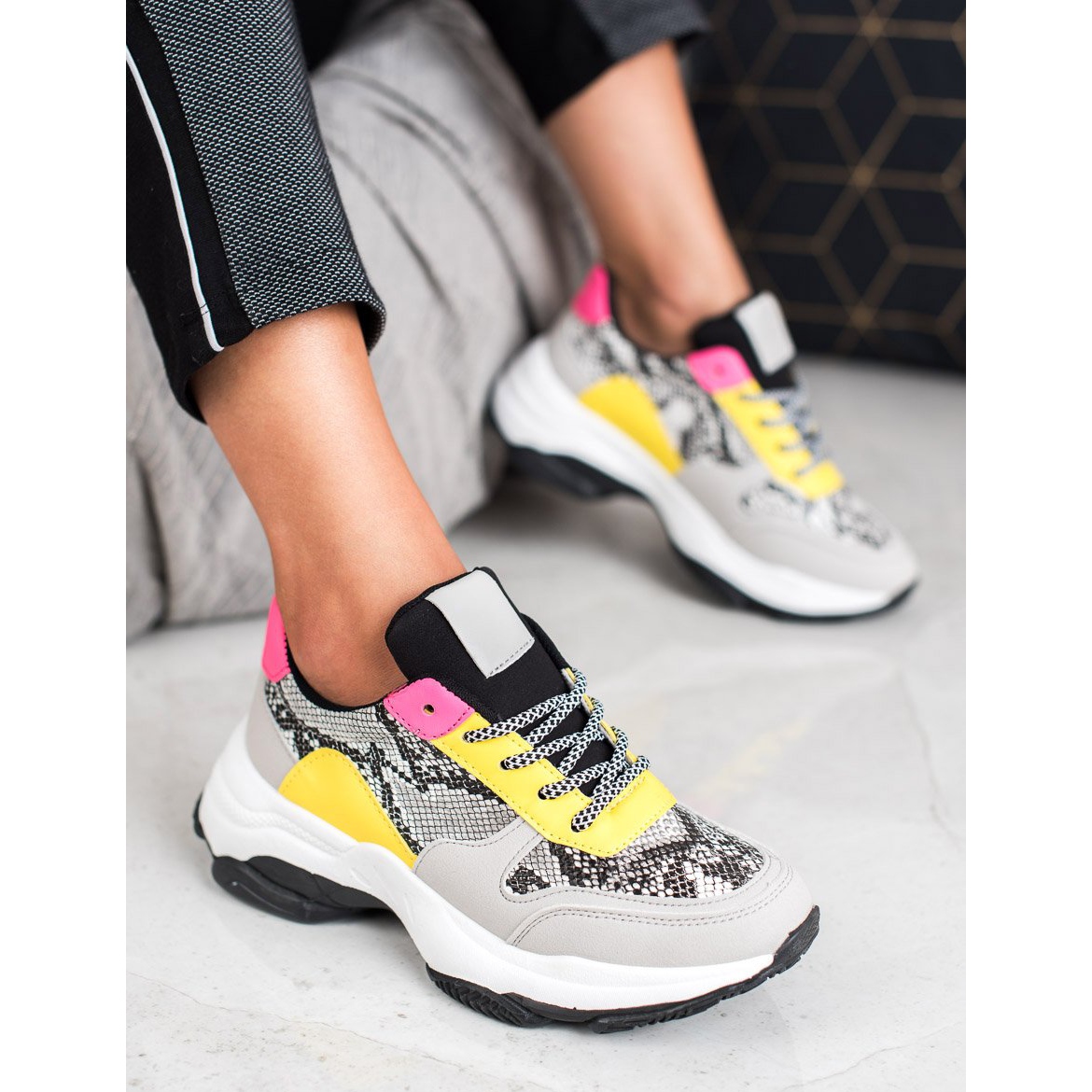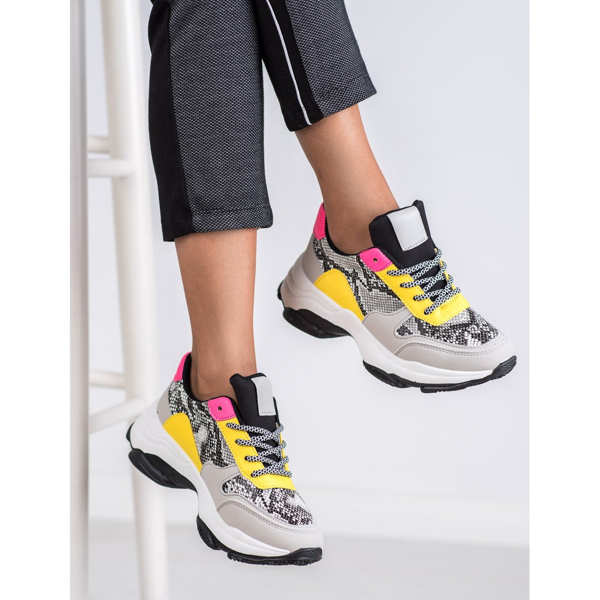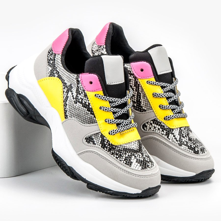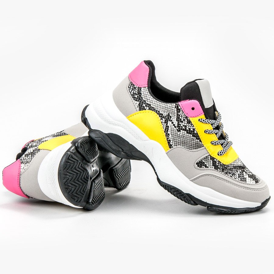 Faites passer la mode au niveau supérieur avec les baskets colorées SHELOVET Snake Print ! Ces chaussures uniques se distinguent par un motif serpent et des empiècements énergiques dans les tons jaune et rose, qui attireront certainement l'attention et donneront du caractère à n'importe quel style.