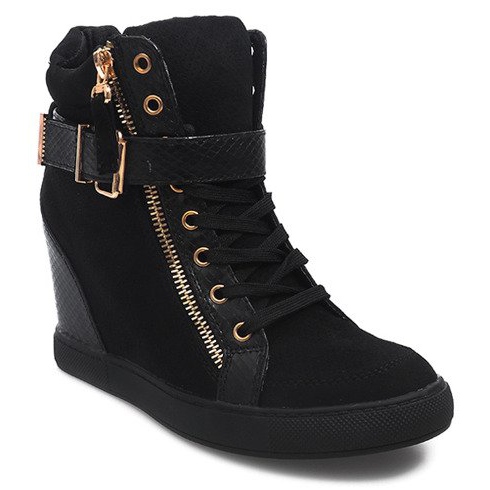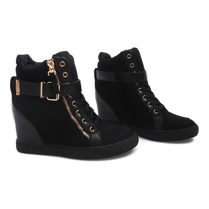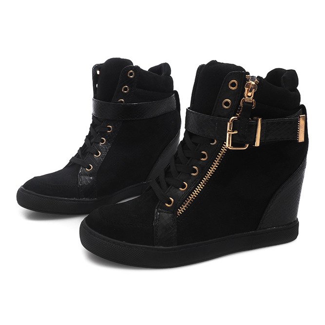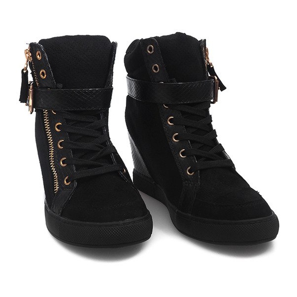 Découvrez les baskets compensées stylées 100-769 dans une élégante couleur noire ! Ces chaussures uniques sont une combinaison parfaite de design à la mode et de confort qui fonctionneront dans toutes les situations. La hauteur de la cale est de 8 cm, ce qui allonge optiquement les jambes et ajoute un charme féminin.
