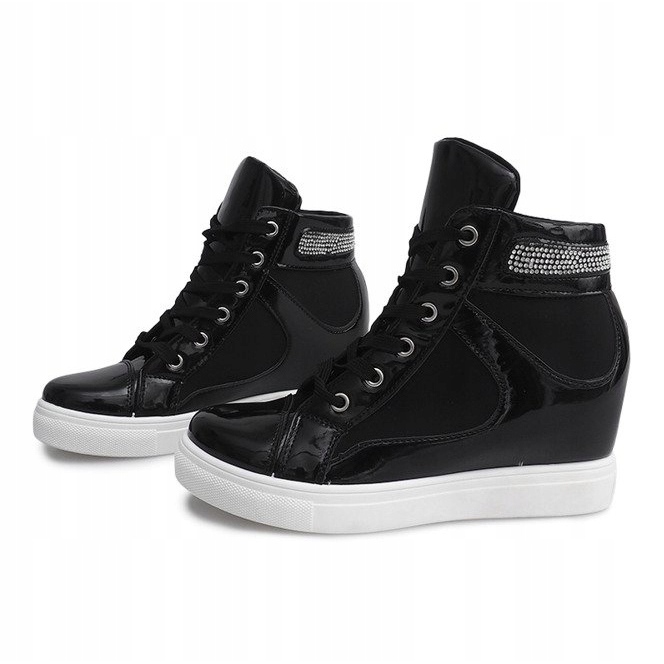 Les chaussures sont fabriquées dans un matériau semblable à du cuir noir de haute qualité, ce qui garantit non seulement un aspect esthétique, mais également une durabilité. La hauteur de la cale de 6 cm garantit un confort de port et des semelles épaisses blanches avec une petite plateforme ajoutent de la stabilité, ce qui est extrêmement important dans les situations quotidiennes.