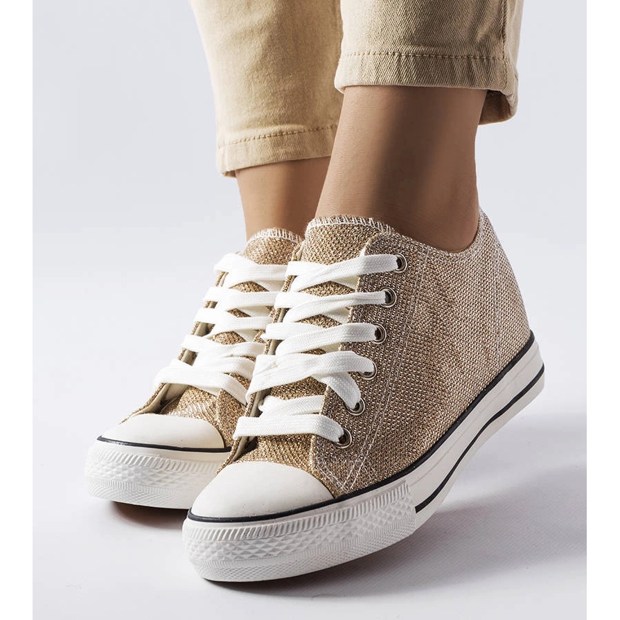 Le fabricant a décidé de fabriquer les baskets en plastique de haute qualité, ce qui garantit à la fois durabilité et confort de port. La couleur dorée leur confère un caractère unique, ce qui les rend parfaits pour un usage quotidien et pour les occasions spéciales. La semelle en caoutchouc beige ajoute un contraste subtil et offre une excellente adhérence, essentielle au style de vie actif d'une femme moderne.