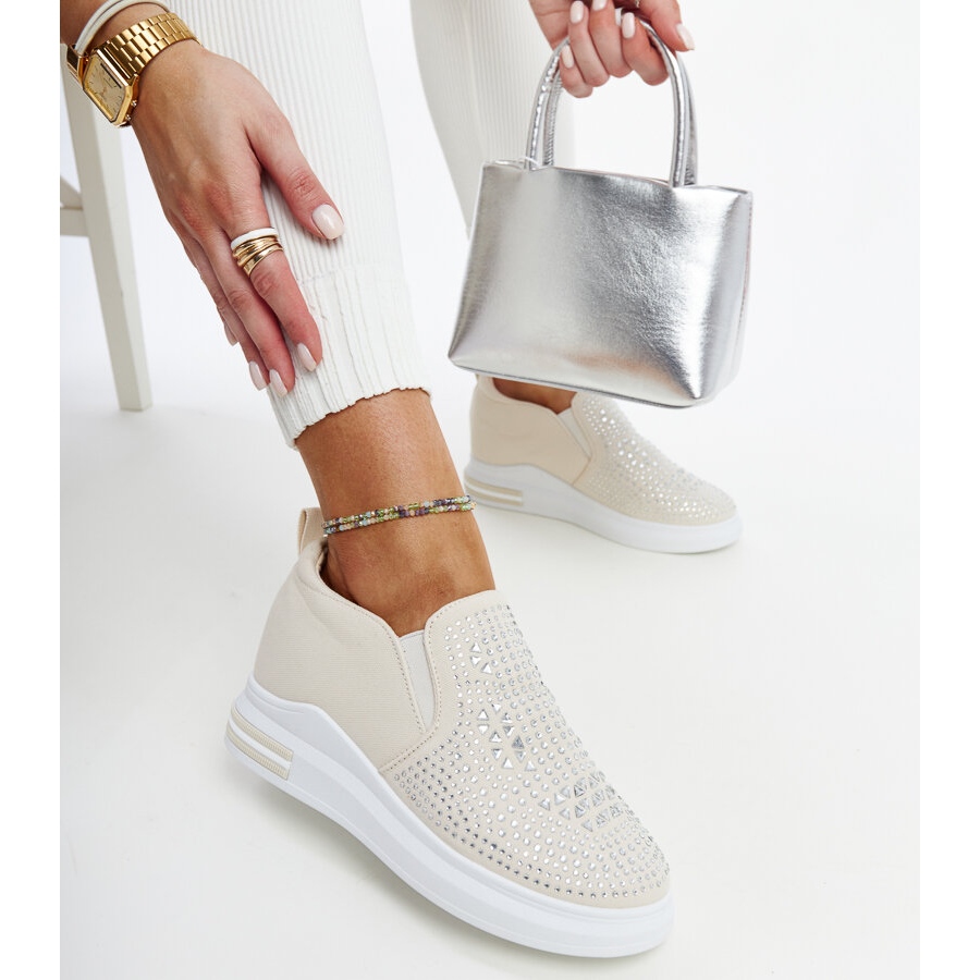 Ce modèle se caractérise par une semelle légère en caoutchouc qui assure un confort et une excellente adhérence sur diverses surfaces. La hauteur du coin de 7 cm ajoute une élégance subtile et vous permet en même temps de vous déplacer confortablement tout au long de la journée. La couleur beige s'accorde parfaitement avec les tenues d'été, et les strass décorant les chaussures ajoutent une pincée de brillance.