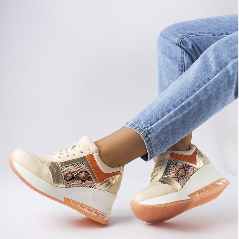 Fabriquées en cuir écologique de haute qualité, les baskets offrent non seulement un aspect esthétique, mais aussi une durabilité. Un avantage supplémentaire est le talon compensé pratique, qui assure stabilité et soutien aux pieds. La couleur beige avec des accents dorés permet à ces chaussures de s'adapter parfaitement à différents styles, à la fois décontractés et plus élégants.