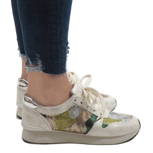 Nous vous présentons les baskets compensées de sport blanches T025 en gris, qui allient parfaitement style et confort. Ces élégantes baskets pour femme se distinguent par une belle décoration de paillettes sur la tige, qui leur confère un caractère unique. Grâce au laçage, la chaussure s'adapte parfaitement au pied et le bout rond assure un confort de port.