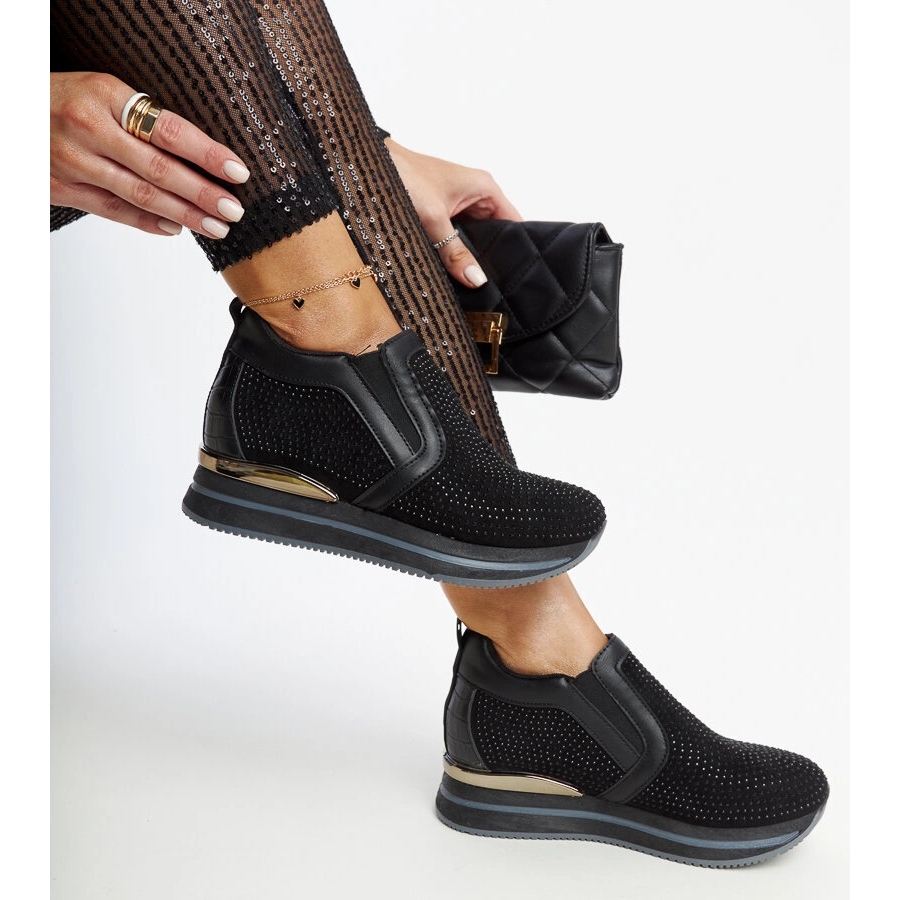 Les baskets compensées noires sont une combinaison de classique et de design moderne, créées pour les femmes qui apprécient avant tout le confort et le style. La caractéristique qui distingue ces chaussures des autres sont des strass élégamment brillants, qui leur confèrent élégance et éclat. Grâce à cela, ces baskets basses acquièrent un caractère qui rend même le style le plus simple plus attrayant.