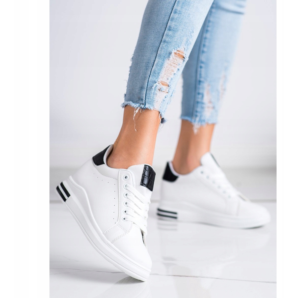 Grâce à la cale cachée de 5 centimètres, vous gagnerez quelques centimètres de hauteur, ce qui mettra en valeur votre silhouette sans sacrifier le confort. Les baskets blanches avec empiècements noirs s'intègrent parfaitement dans les tendances actuelles, vous permettant de les combiner facilement avec divers vêtements - des jeans aux robes aérées.