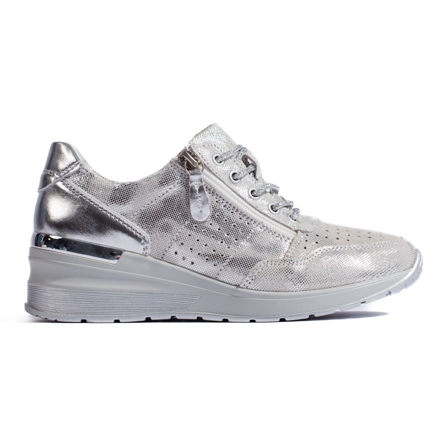 Nous vous présentons des baskets compensées en cuir de couleur argent tendance d'une marque renommée. Ces chaussures de sport élégantes allient confort, style et modernité, s'adaptant parfaitement à la tendance de la mode. La hauteur de cale de 4 cm assure une excellente stabilité et souligne en même temps la silhouette subtilement.