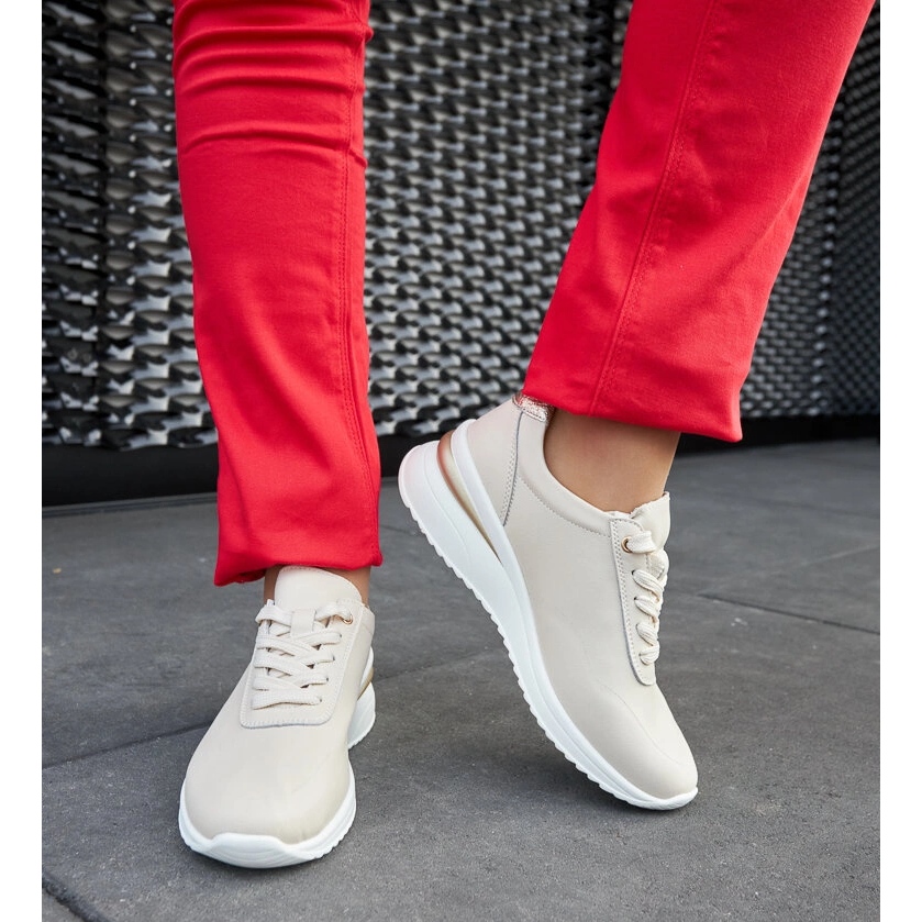 Ces baskets compensées en cuir beige sont des chaussures tendance et confortables pour les femmes. Les chaussures sont en cuir naturel, ce qui garantit leur durabilité et leur confort de port. Elles sont équipées d'une semelle en caoutchouc qui offre une excellente adhérence et une excellente absorption des chocs, ce qui augmente encore le confort de marche. Les baskets ont une fermeture à lacets, vous pouvez donc facilement les ajuster à votre pied.