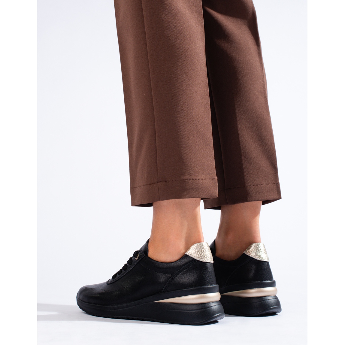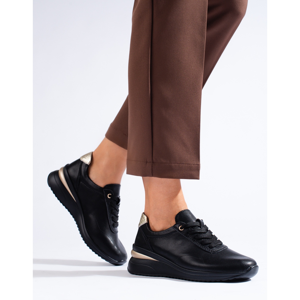 Les baskets compensées en cuir noir de Shelovet allient le confort des chaussures de sport avec un style unique. Créé pour les femmes modernes qui recherchent des chaussures de tous les jours alliant confort et design tendance. Grâce à l'utilisation d'une plateforme de 5 centimètres, ce modèle est parfait pour les femmes qui souhaitent ajouter quelques centimètres à leur taille, tout en conservant un pas naturel et une stabilité.