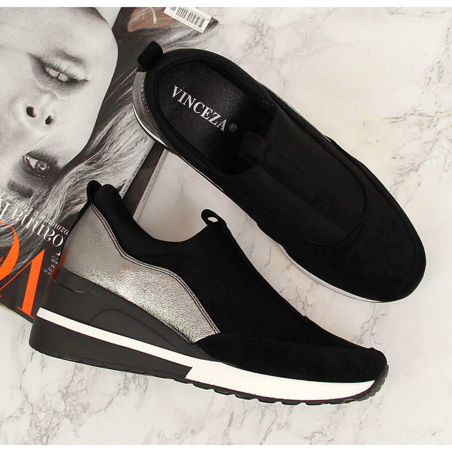 Les baskets compensées noires et argentées pour femme de la marque VINCEZA sont la quintessence d'un style moderne qui allie parfaitement confort et look tendance. Ces belles chaussures, montées sur une cale décorative de 6 cm de haut, sont une solution parfaite aussi bien pour un usage quotidien que lors d'activités sportives.