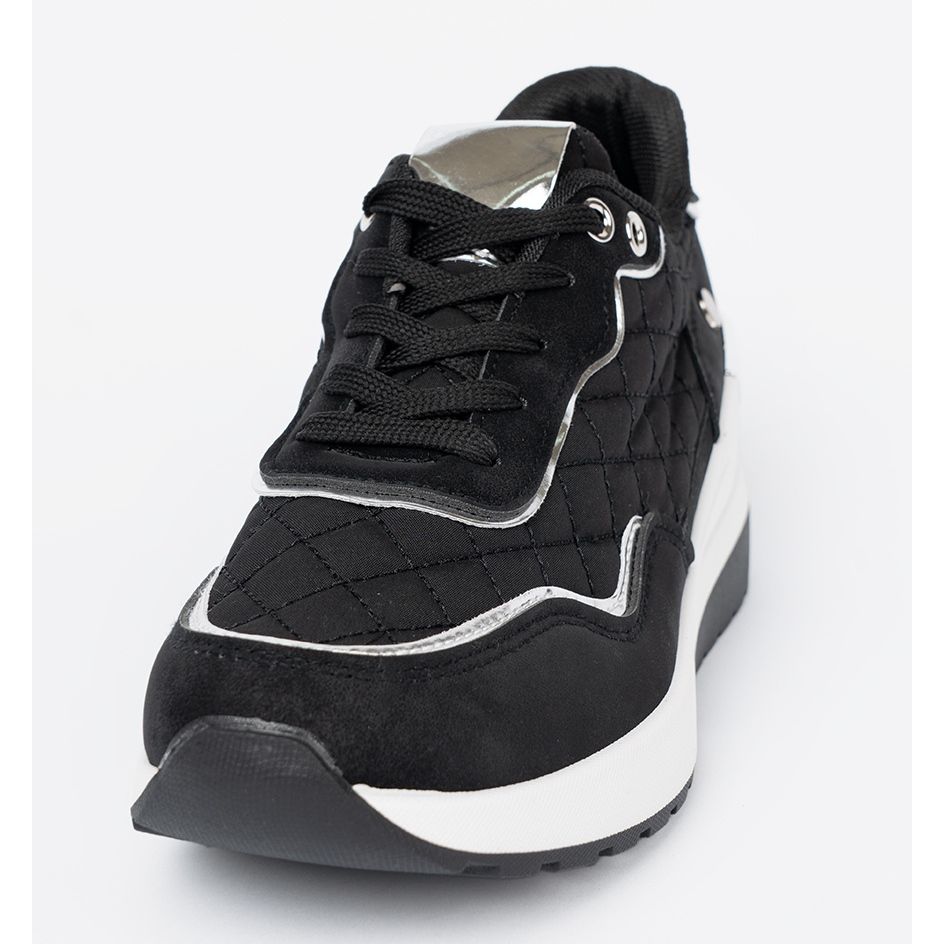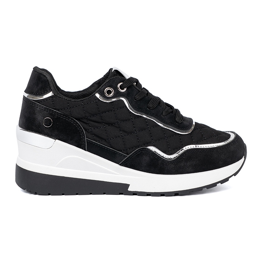 Les baskets noires se distinguent par le sport, mais aussi le style de la mode, ce qui les rend polyvalents et associent de nombreuses stylisations de tous les jours. Grâce à la hauteur de la plate-forme de 6 cm et du talon de talon jusqu'à 8 cm, ils fournissent un soutien et une commodité adéquats, parfaits à la fois sur une promenade et pendant l'activité dans la ville.