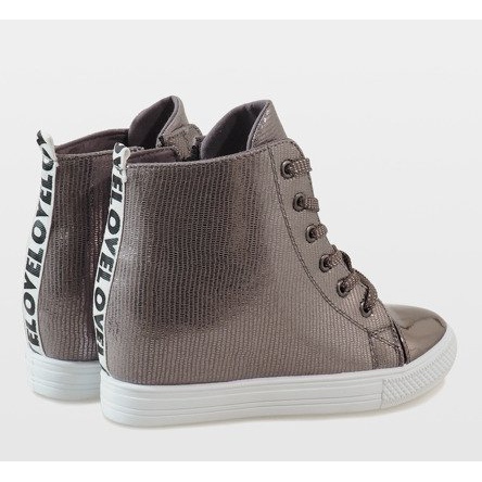 Fabriquées en cuir écologique légèrement brillant dans une nuance de gris tendance, ces baskets attirent l'attention grâce aux rayures blanches avec les inscriptions "Love" qui décorent habilement l'arrière des chaussures. De tels détails font de chaque étape un petit manifeste de style personnel.