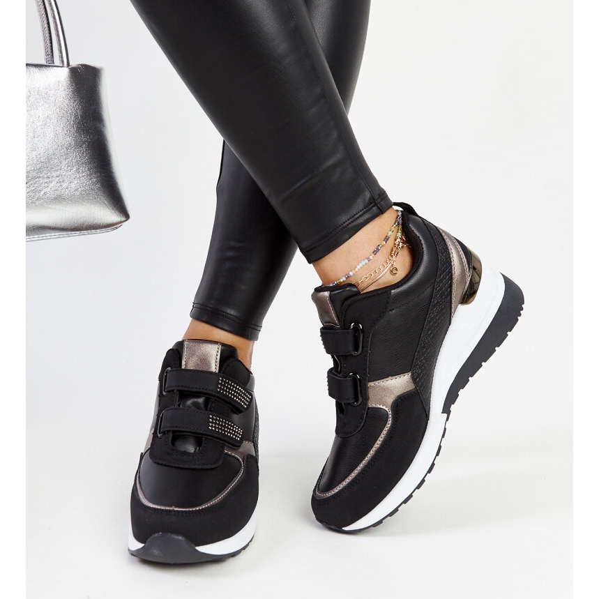 Grâce à la fixation pratique du fermeture scratch, vous pouvez facilement mettre ces chaussures et correspondre parfaitement au pied. Leur couleur noire universelle, combinée à des accents dorés, rend les baskets se mélange parfaitement à diverses stylifications - de décontracté à plus élégant.
