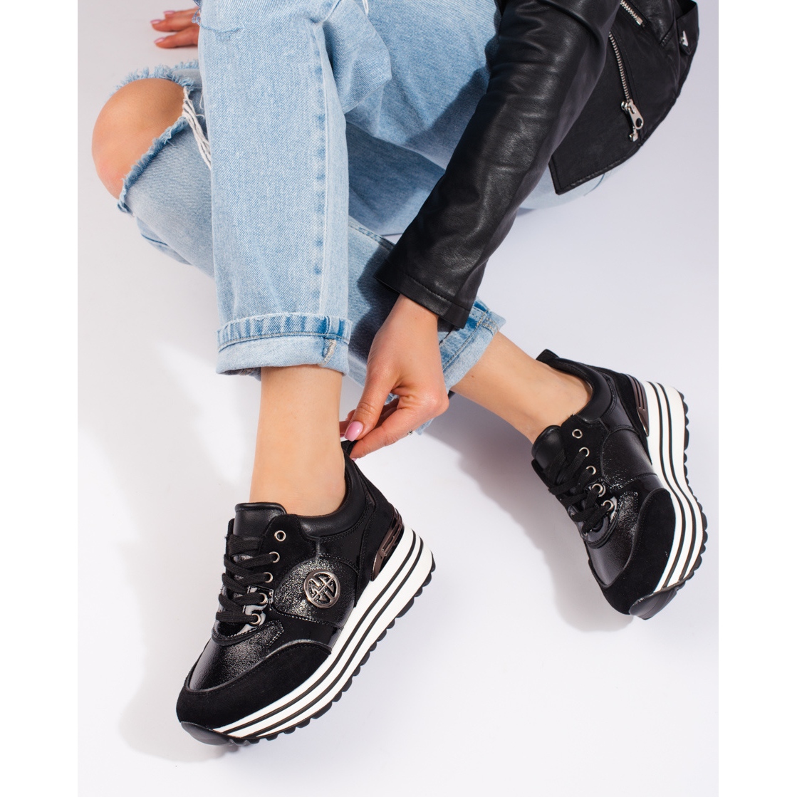 Les baskets se distinguent par un talon intégré solide, qui assure la stabilité, et une semelle en caoutchouc avec bande de roulement, assurant une excellente adhérence. Une plateforme haute de 4 cm ajoute non seulement quelques centimètres de hauteur, mais souligne également le design moderne des chaussures.