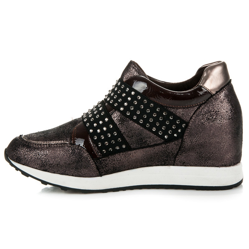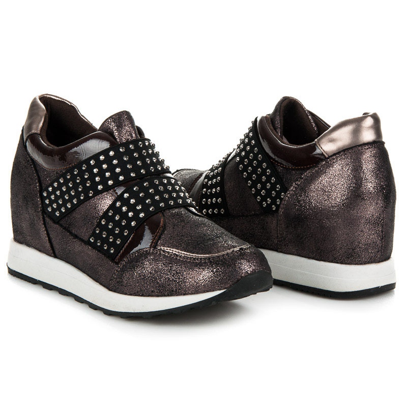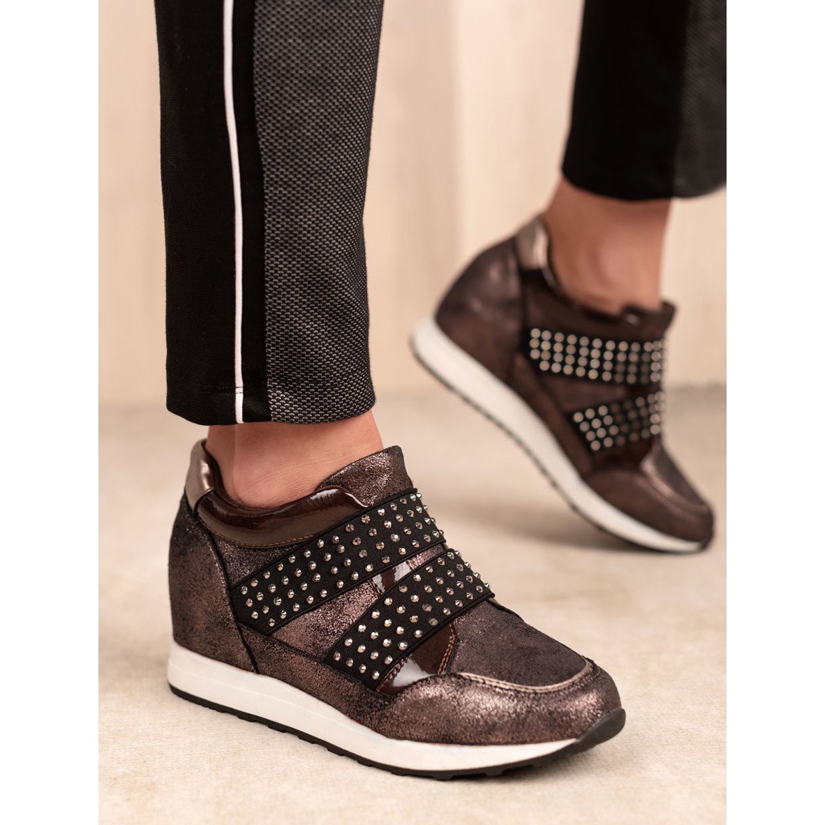 Les chaussures sont fabriquées à partir de matériaux de haute qualité, ce qui garantit non seulement la durabilité, mais également le confort de port. Une cale stable et cachée d'une hauteur de 8 cm allonge optiquement les jambes et garantit en même temps le confort même lors de longues promenades. Des décorations supplémentaires sous forme de strass et de clous métalliques leur confèrent un look original qui attirera certainement l'attention.