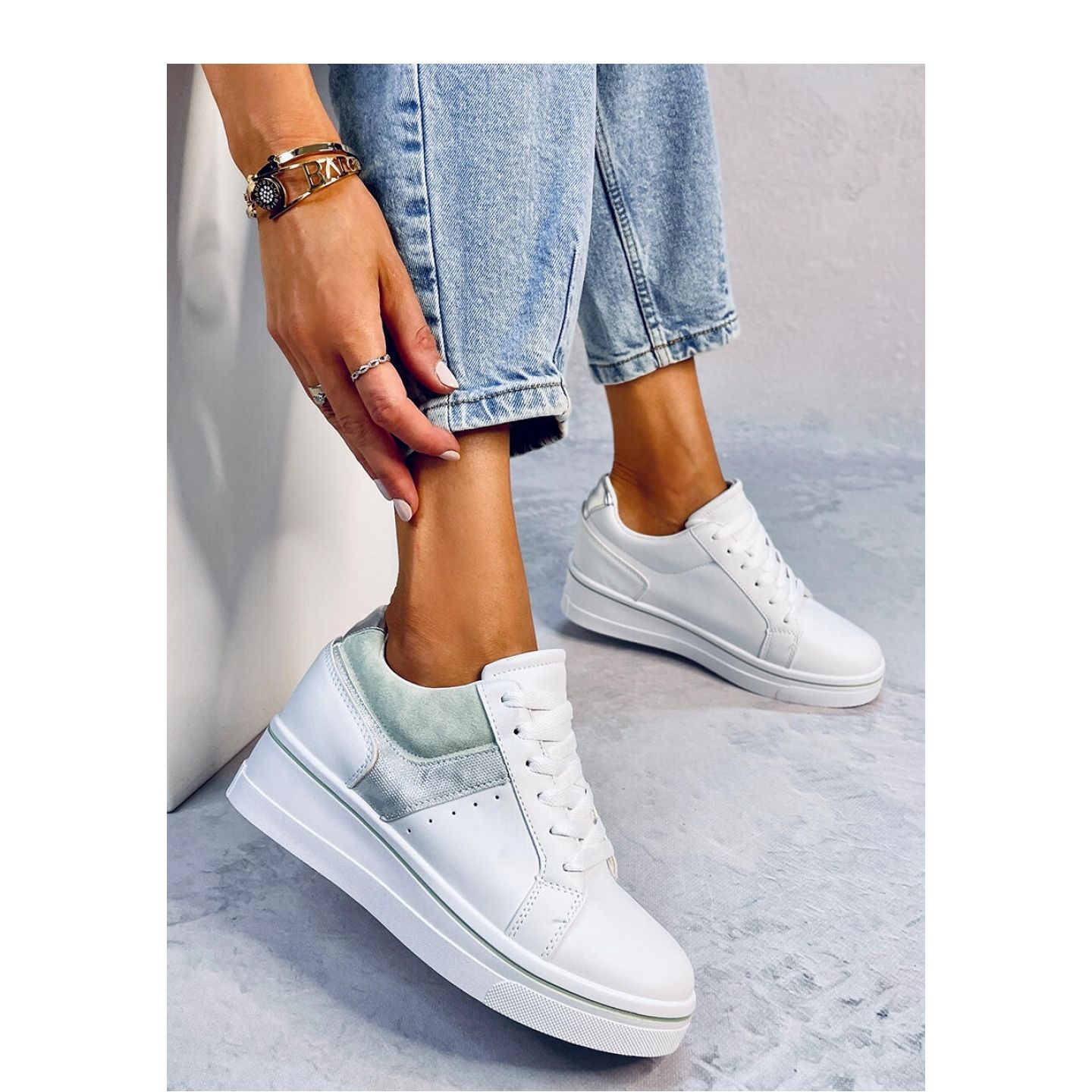 Les baskets sur un coin blanc en blanc sont une combinaison parfaite de style et de confort, qui attirera certainement l'attention. Ces deux chaussures de sport colorantes, avec des accents verts caractéristiques, du daim et des inserts métalliques, se distinguent par d'autres modèles. Avec une hauteur du coin de 7 cm, ils ajoutent un look spectaculaire, sans abandonner le confort de porter.