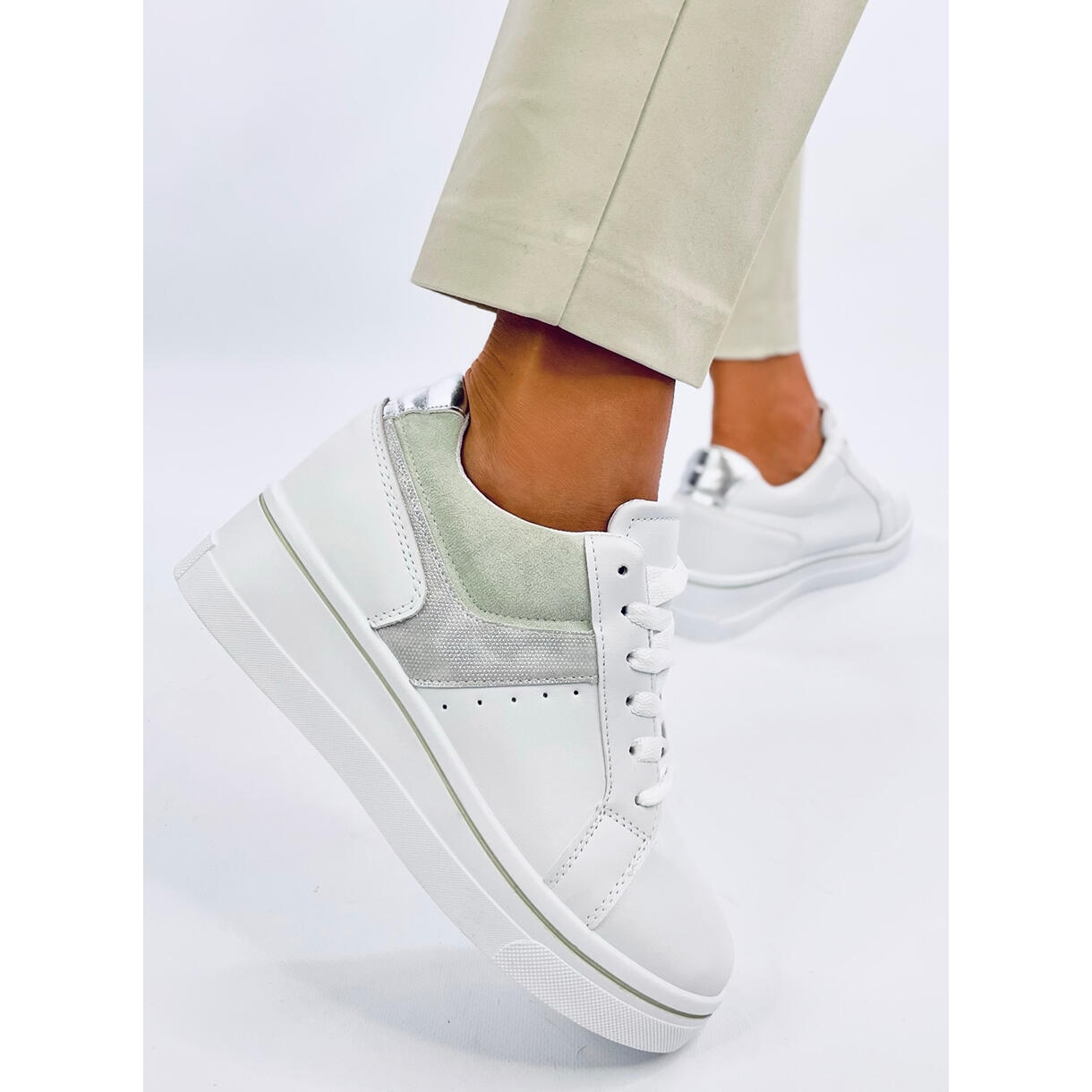 Les designers se sont concentrés sur une esthétique unique, combinant du cuir écologique blanc avec des empiècements verts en daim et des détails métalliques. Effet? Des chaussures qui attirent l'attention et se démarquent avec audace des autres. Des baskets compensées d'une hauteur allant jusqu'à 7 cm souligneront subtilement votre silhouette, tout en assurant un confort de port tout au long de la journée.