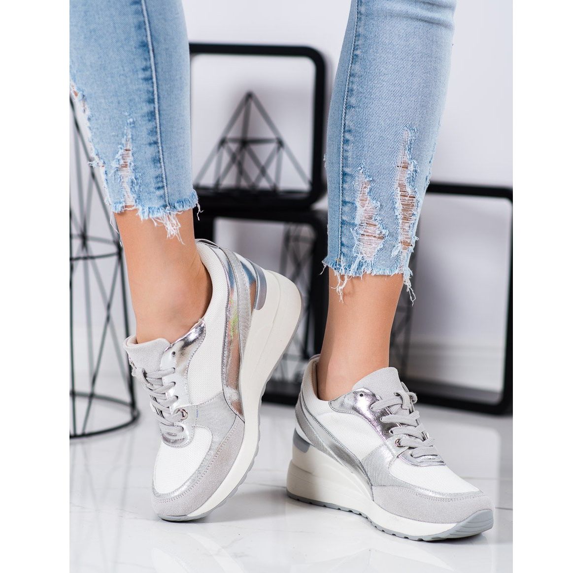 La tige des chaussures est composée de matériaux de haute qualité - une combinaison de simili cuir et de textile polyester, qui garantit durabilité et confort de port. Un talon doux et fermé avec des inserts décoratifs argentés ajoute de l'élégance et distingue les baskets des autres modèles.