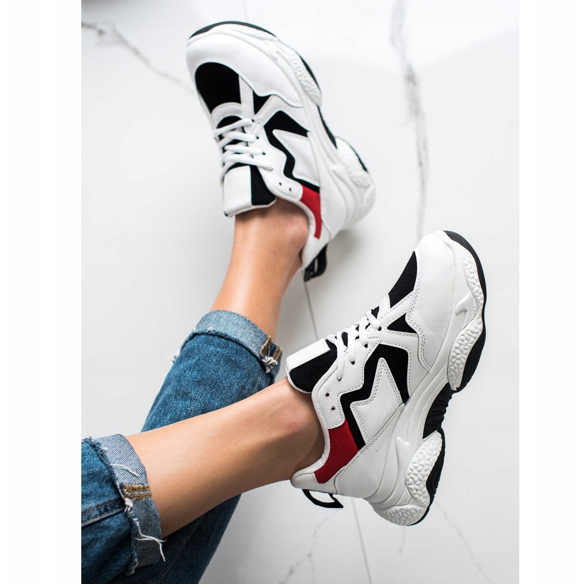 Les accents colorés sous forme de détails noirs et rouges ajoutent du caractère aux chaussures, les rendant parfaitement assorties aux jeans et aux robes. Leur style sportif et l'absence de talon garantissent un confort au quotidien, tandis que le talon souple et intégré offre un soutien adéquat au pied.