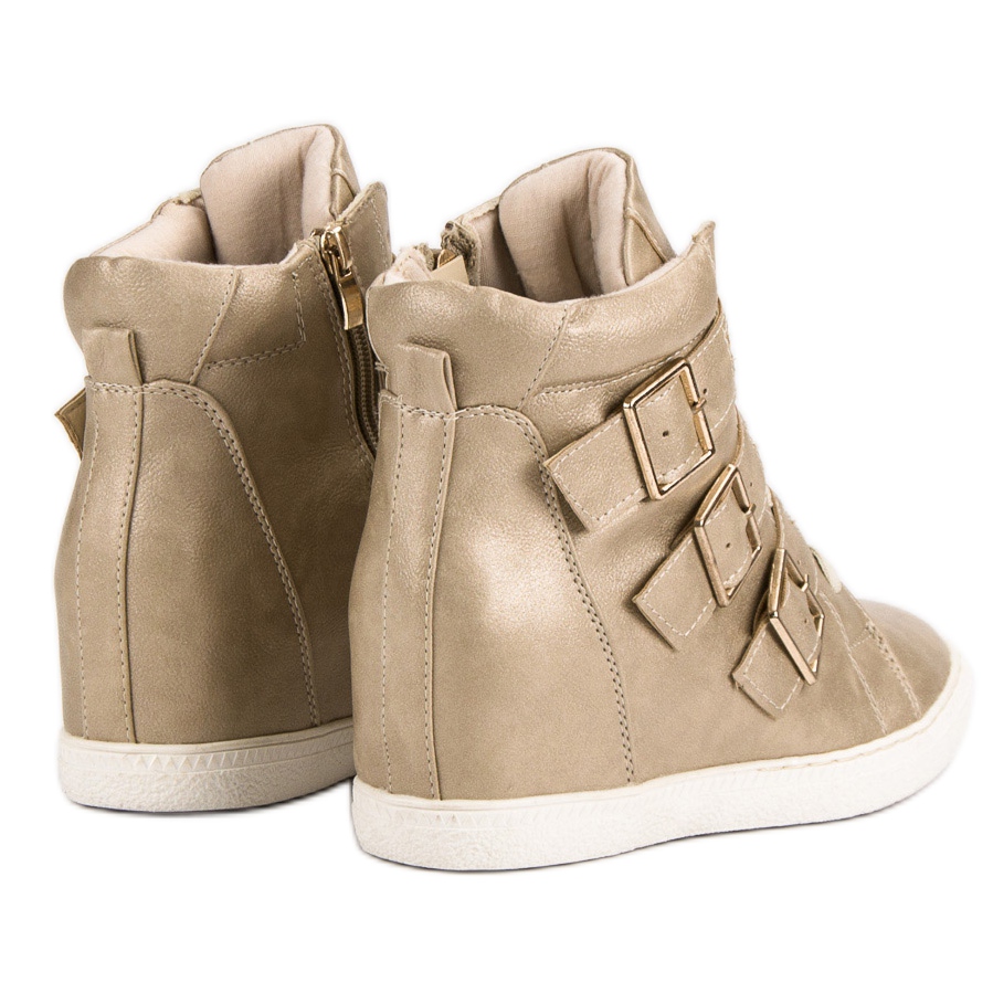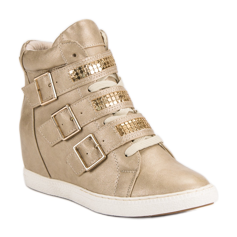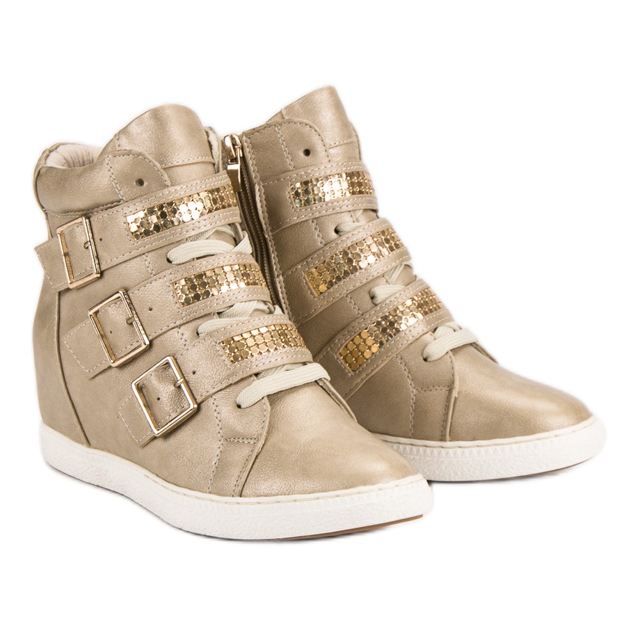 Ces baskets se distinguent par une cale cachée de 6 cm de haut, qui rehausse la silhouette et ajoute de la finesse à n'importe quel style. Un avantage supplémentaire est l'impressionnante finition en paillettes sur les brides fermées par des boucles, qui rend ces chaussures non seulement pratiques, mais aussi à la mode.