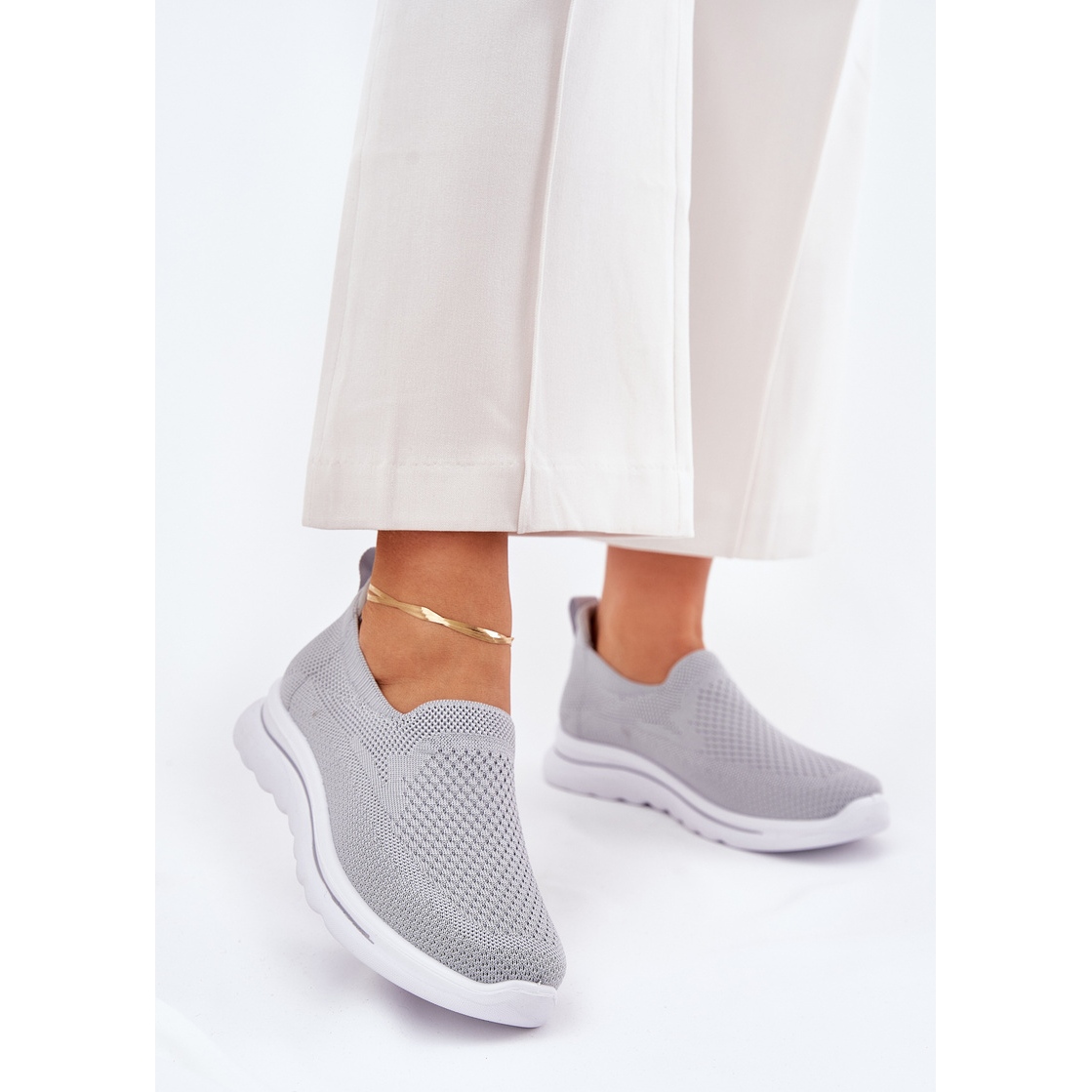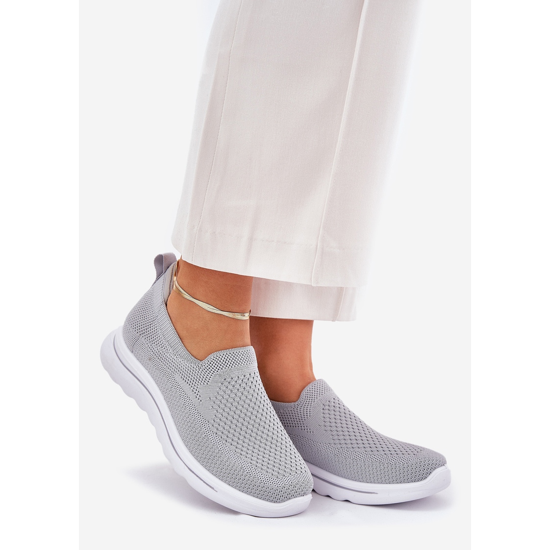 Nous présentons des baskets matérielles pour femmes insérées dans une nuance élégante de gris, qui deviendra le complément parfait à toute stylisation quotidienne. Ces slip-ons modernes avec la tige devant la cheville ont été conçus pour le confort et le style. Fabriqués en matériau textile de haute qualité, ils sont non seulement légers, mais aussi aérés, ce qui les rend excellentes les jours plus chauds.