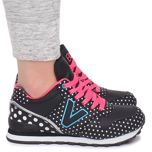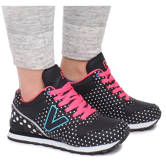 Découvrez un style unique avec les baskets de sport noires B1573-1 ! Ces chaussures à la mode sont un choix parfait pour les femmes qui veulent se démarquer. Elles se caractérisent par un motif original de pois blancs sur une surface noire, et des lacets roses leur confèrent un caractère unique. Il y a une lettre « V » cousue sur le côté des chaussures, qui souligne leur design unique.