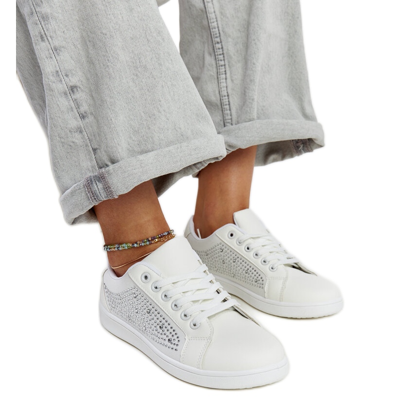Le design à la mode de baskets blanches avec des zircons attire l'attention et en fait un élément unique de la stylisation de chaque été. Le nez rond leur donne une universalité, et le fermoir lacé vous permet d'adapter les chaussures aux besoins individuels.