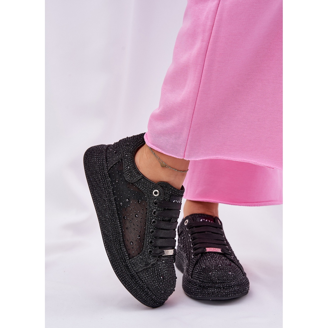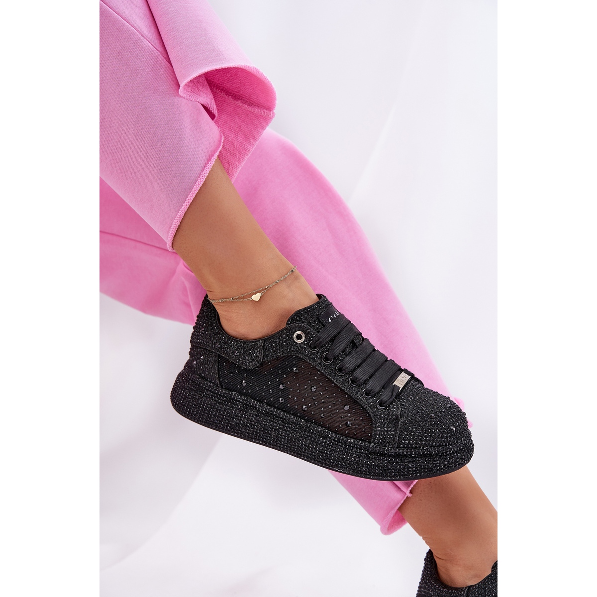 Décorés de cristaux subtils, ces baskets ajoutent une lueur élégante de toute stylisation, se démarquant d'autres modèles. Leur design innovant sur une plate-forme de 3,5 cm de haut assure non seulement la stabilité, mais aussi le confort du port, ce qui en fait le choix parfait pour de longues journées en mouvement. De plus, les orteils arrondis garantissent le confort, ce qui rend ces chaussures parfaites pour les tenues sportives et décontractées.