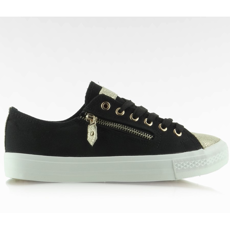 Baskets classiques en toile BL28P de couleur noir universel avec des bouts dorés brillants et une subtile fermeture éclair sur le côté de la tige. Une coupe simple et intemporelle est combinée à un accent tendance, ce qui rend les chaussures adaptées aussi bien à un usage quotidien qu'à un style plus décontracté. Confortable, solide et léger, parfait pour la saison printemps-automne et les soirées d'été.