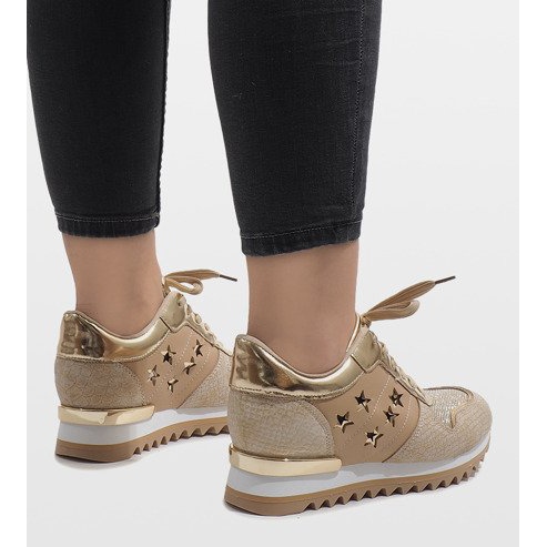 Les baskets sont dotées d'une fermeture à lacets pratique qui permet un ajustement facile au pied. Des cales basses mais stables de 6 cm de hauteur et une plateforme plus épaisse (2 cm) garantissent un confort de port tout au long de la journée, tout en allongeant optiquement les jambes. Le bout rond rend les chaussures extrêmement confortables et leur couleur dorée élégante peut être facilement combinée avec différents styles.