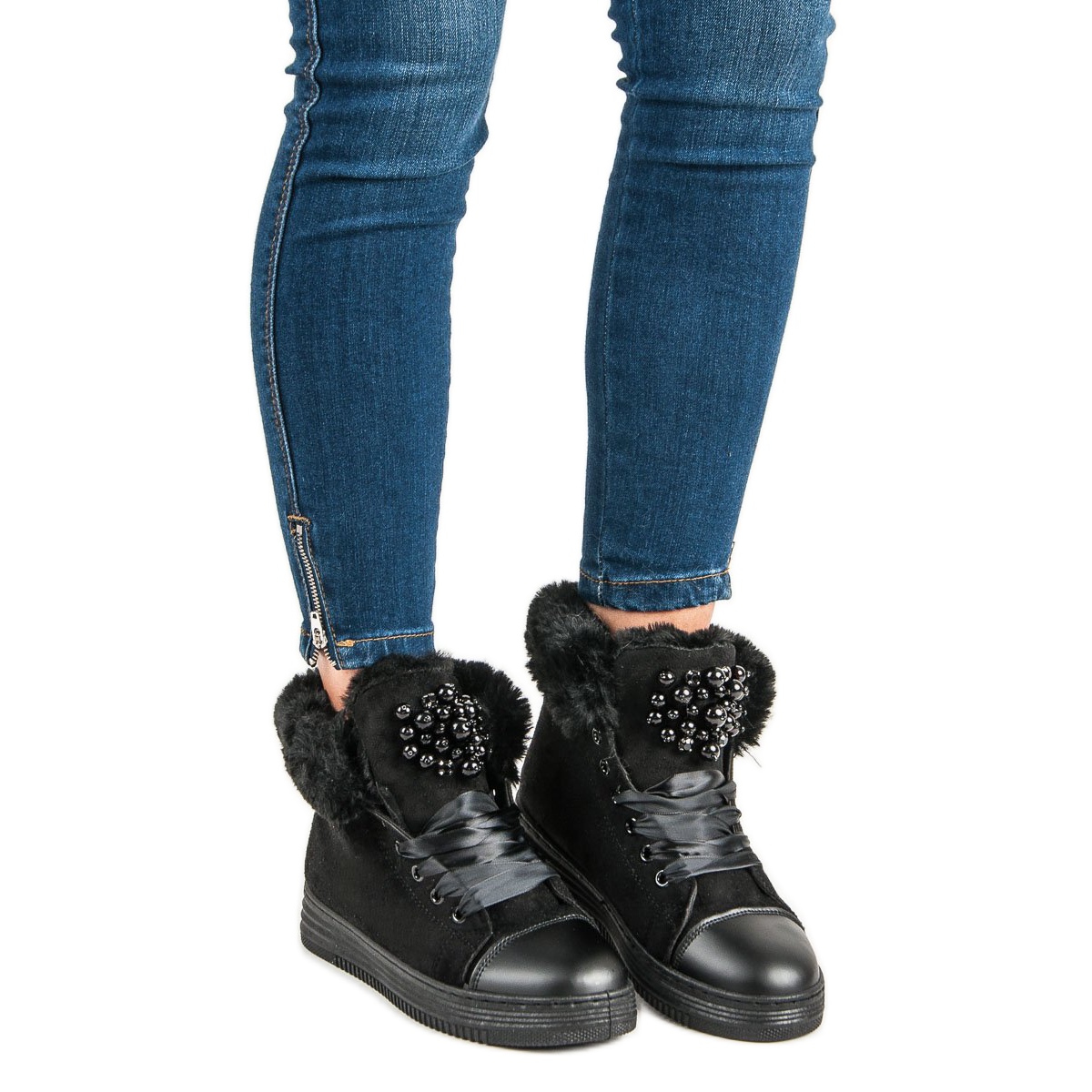 La tige noire caractéristique est décorée d'une fourrure délicate, qui non seulement souligne le style des baskets, mais apporte également confort et chaleur. Grâce à une petite plateforme de 3,5 cm de hauteur et une semelle en caoutchouc, chaque pas devient un plaisir et garantit la stabilité sur diverses surfaces.
