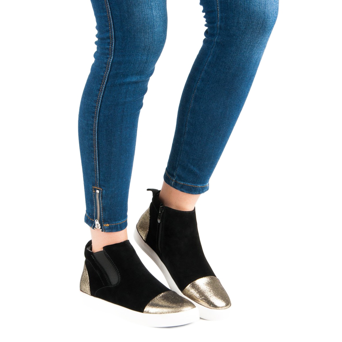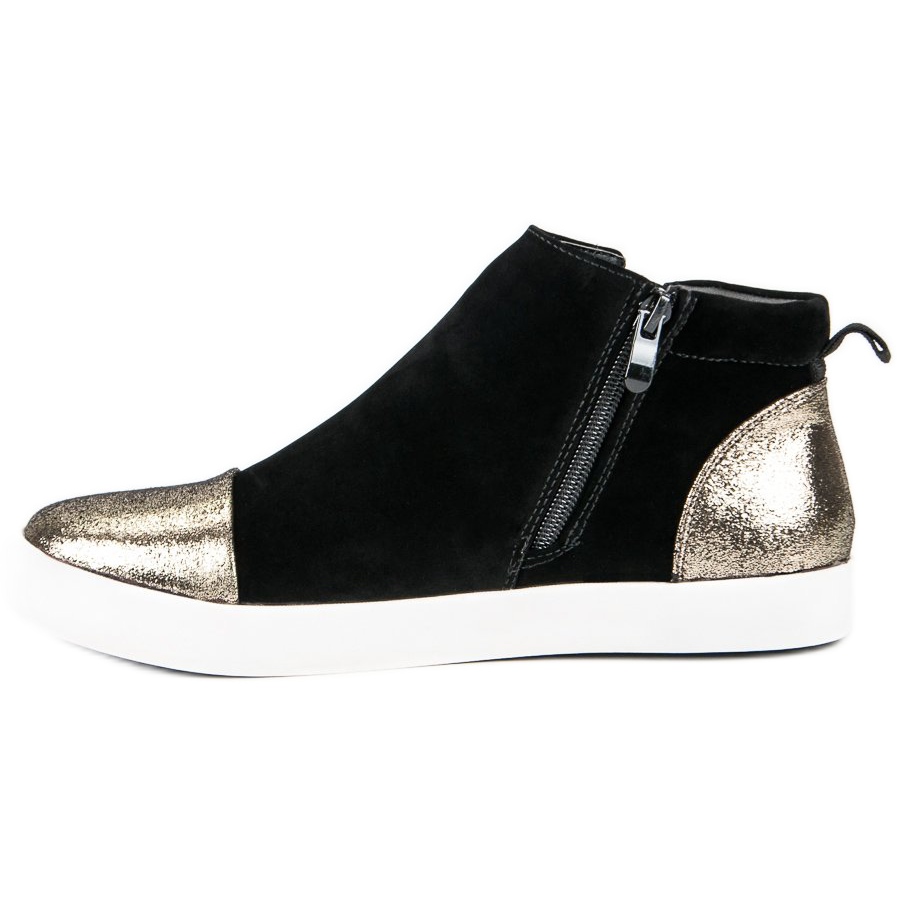 Nous vous présentons les élégantes baskets J. Star pour femmes qui allient parfaitement style et confort. Ces chaussures noires en éco-daim ont un look unique grâce aux finitions dorées brillantes sur le bout arrondi et le talon. Les baskets sont fermées par une fermeture éclair pratique et la tige arrive sous les chevilles, ce qui les rend parfaitement ajustées au pied.