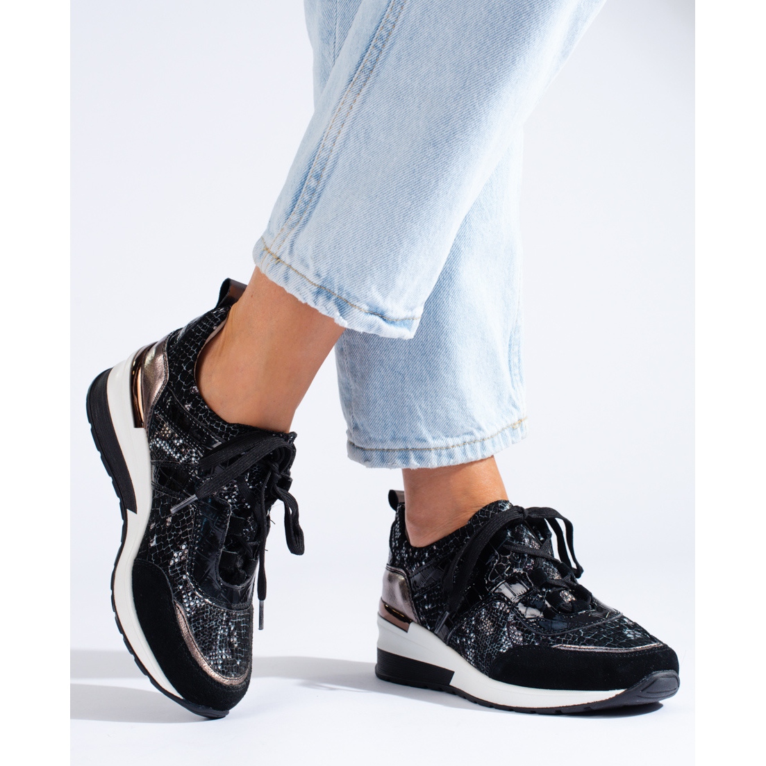 Nous présentons des baskets uniques de Goodin qui combinent un style sportif avec un accent de mode. Le modèle de baskets en cuir imprimé serpent d'une élégante couleur noire est un incontournable de la garde-robe de chaque femme.