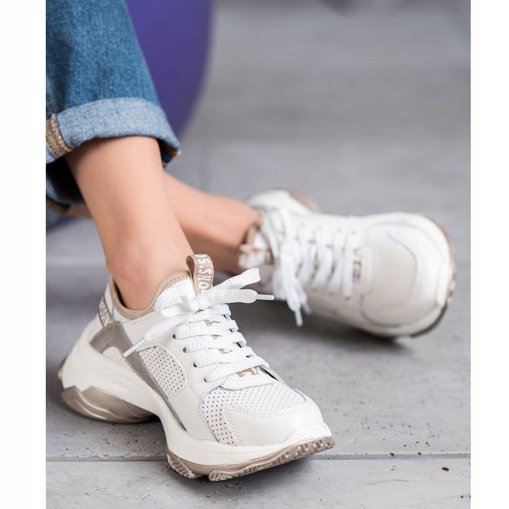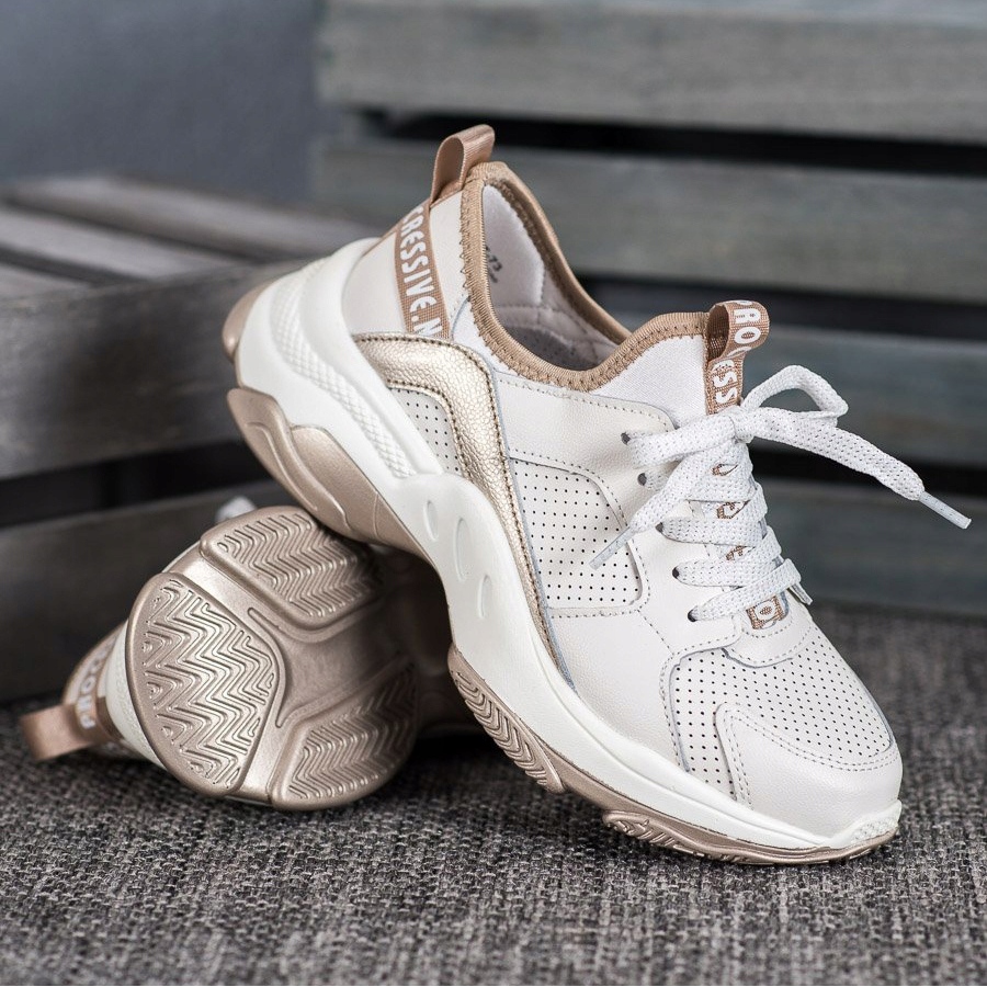 Nous vous présentons les baskets en cuir ajouré de la marque Goodin, qui ravissent par leur design original et leur confort de port. Ces chaussures uniques en blanc et jaune avec des accents dorés supplémentaires sont un choix parfait pour les femmes énergiques qui veulent se démarquer de la foule.