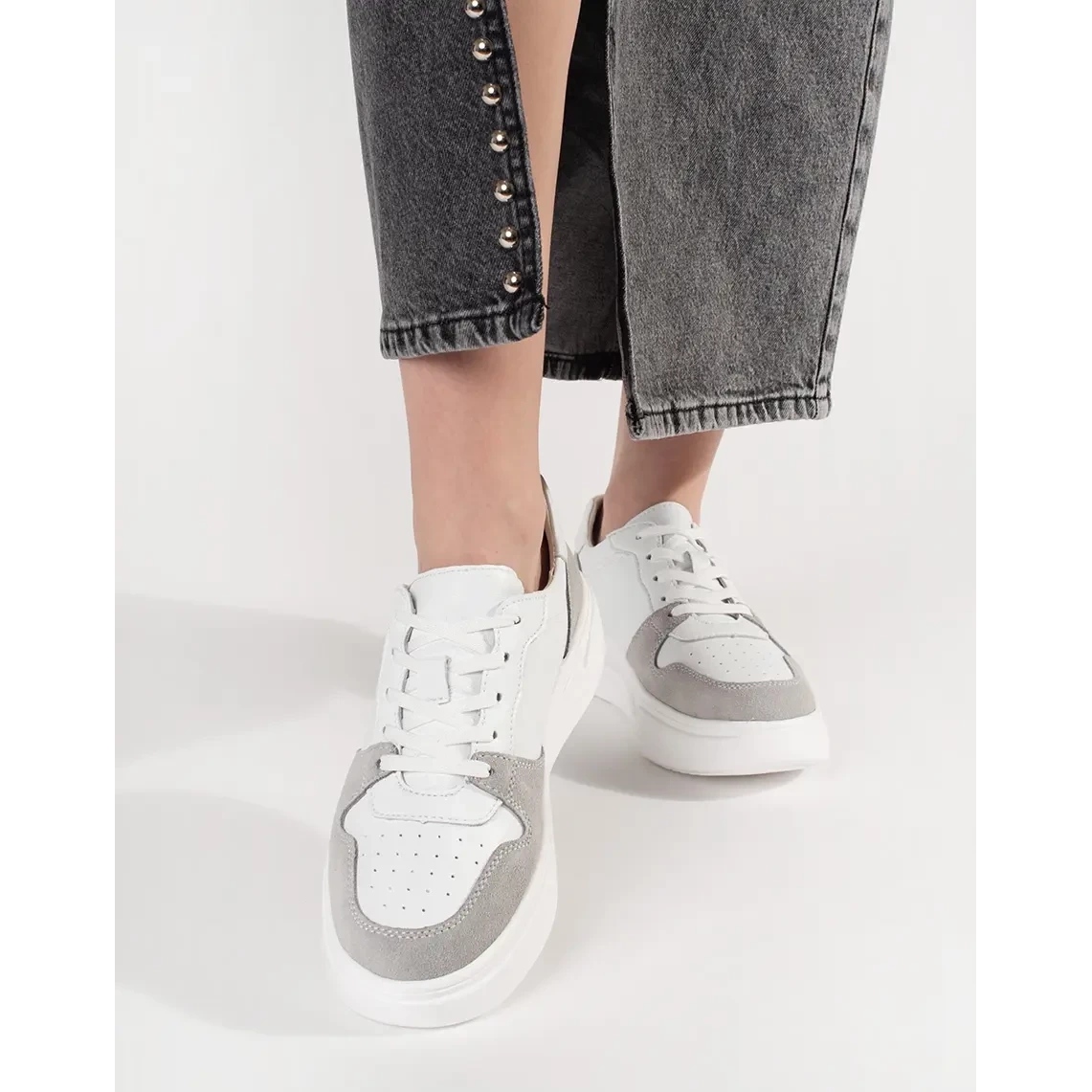 La fixation sous forme de laçage permet un ajustement individuel au pied, ce qui augmente encore le confort du port. Sneakers en cuir blanc Goodin est un incontournable dans la garde-robe de chaque femme moderne qui veut avoir l'air élégant et se sentir à l'aise tous les jours.