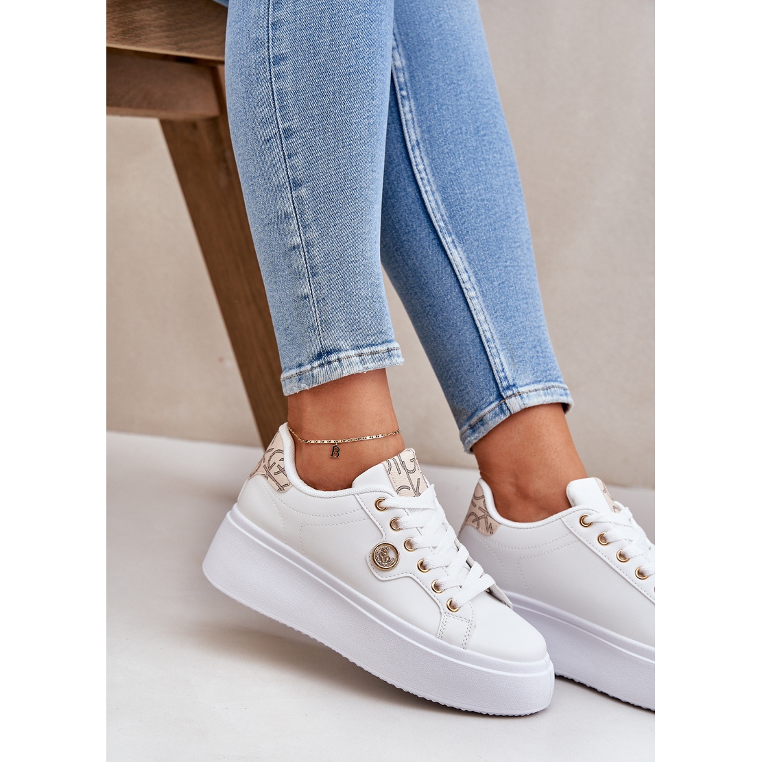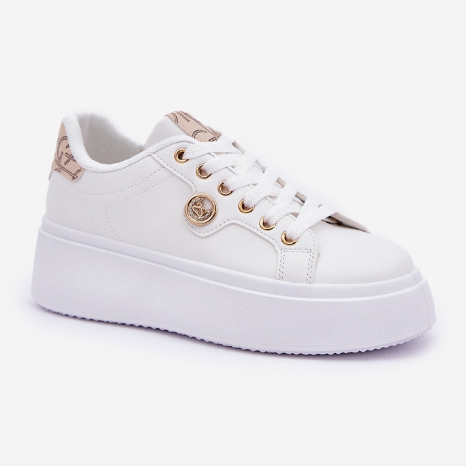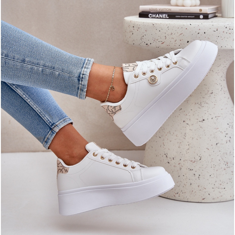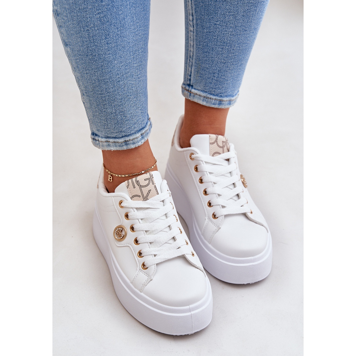 Détails: Baskets en cuir Eco sur une plate-forme avec un détail doré en orge doré blanche