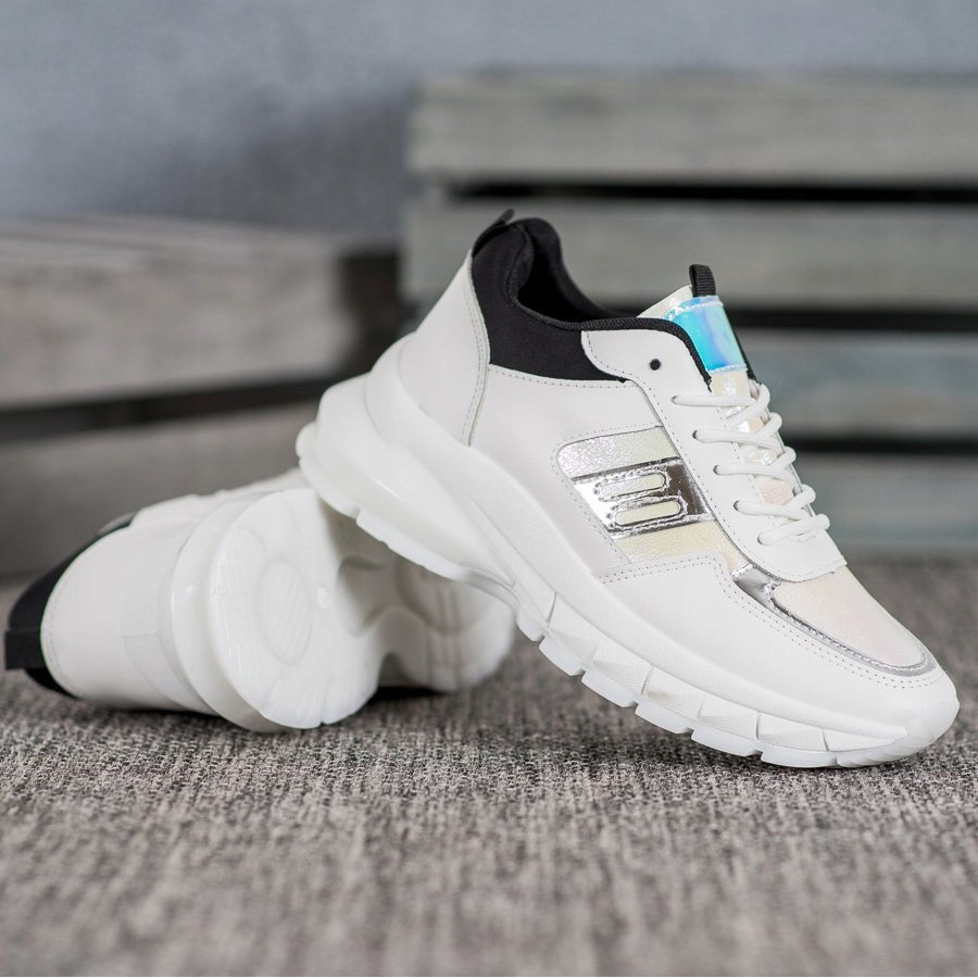Découvrez le dernier modèle de baskets tendance de la marque SHELOVET, qui allient parfaitement style et confort. Ces chaussures de sport blanches classiques sont enrichies d'éléments accrocheurs en noir, bleu et argent, qui attirent l'attention et donnent à l'ensemble un caractère moderne.