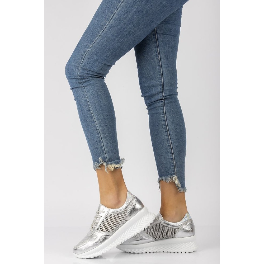 Les baskets se caractérisent par un bout rond, ce qui les rend parfaites pour un style quotidien. Une semelle en plastique de 5,5 cm de hauteur et une plateforme de 3 cm assurent un amorti adéquat, et le matériau synthétique de la semelle garantit une grande durabilité. Le modèle est disponible dans une élégante couleur argentée qui vous permettra certainement de vous démarquer de la foule.
