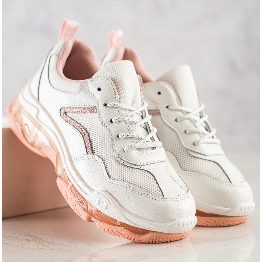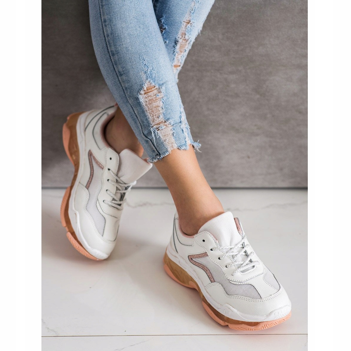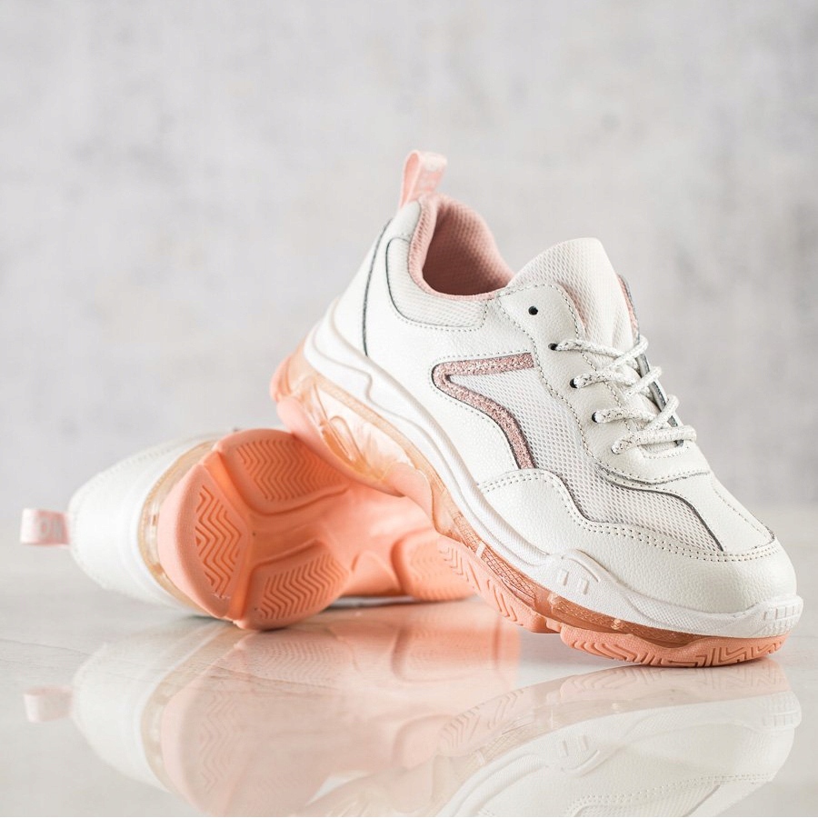 Les baskets se distinguent par des accents délicats, comme un empiècement rose clair situé sous les liens et une décoration en ruban rose au-dessus du talon souple et intégré, qui leur confère un caractère unique. Grâce à la plate-forme de 5 centimètres aux murs décoratifs en relief, vous vous sentirez à la fois confortable et élégant.