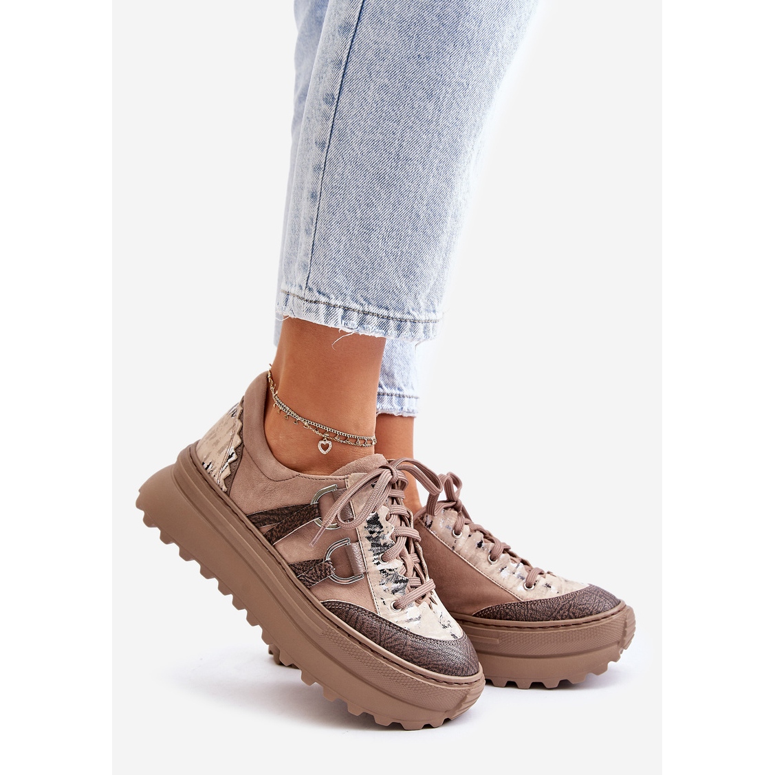Les avantages de ce modèle sont non seulement l'esthétique, mais aussi le confort de l'usure. La plate-forme de 5 cm de haut étend subtilement les jambes, tout en assurant la stabilité et le confort lors de la marche. La tige à motifs est un élément unique qui distingue ces chaussures de l'arrière-plan des autres. Un nez rond et un fermoir lacé font que les chaussures s'adaptent parfaitement au pied, et l'insert de tissu s'occupe du confort tout au long de la journée.