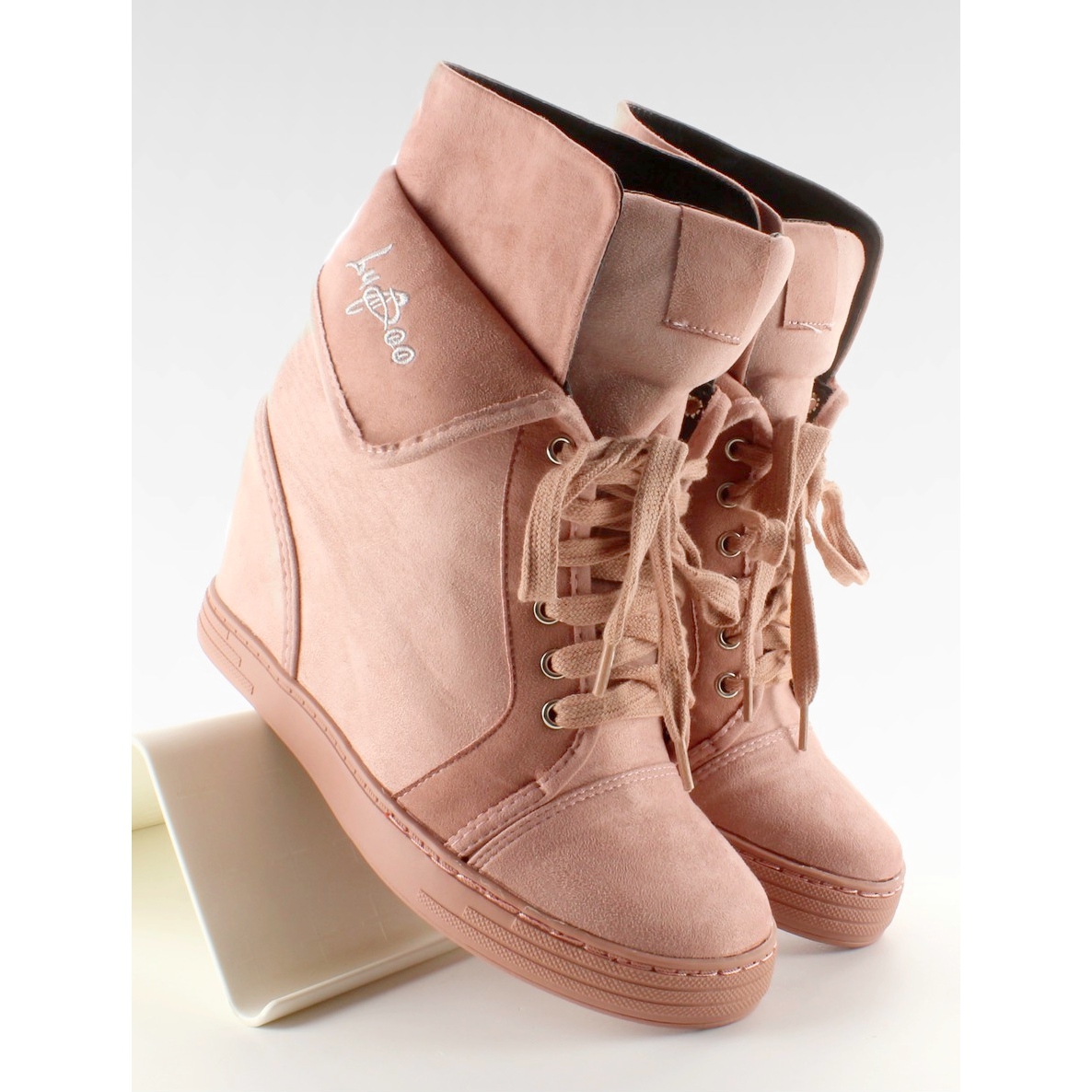 Sneakers pour femmes sensationnelles dans un talon caché, 9 cm de haut. Ils ont une semelle épaisse et sportive, grâce à laquelle ils sont très à l'aise. La tige a une coupe originale avec un col détaché, ce qui leur donne un caractère unique.
