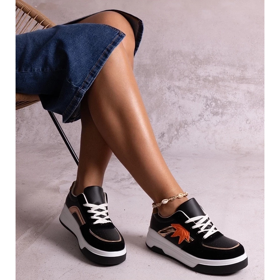 Black Sneakers Eco Suede Kollins du fabricant D / GMR à avoir indispensable cette saison pour chaque femme à la mode! Ces chaussures élégantes combinent un design unique avec le confort, grâce à une semelle haute, qui non seulement ajoute quelques centimètres, mais offre également un excellent amorti lors de la marche.