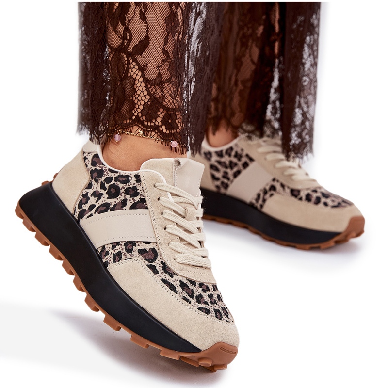 Voici une proposition de baskets féminines élégantes et confortables sur une plate-forme de la marque Vinceza - Modèle 66793 à Beige, avec un motif de léopard à la mode. Ces chaussures de sport en daim sont le choix parfait au quotidien, combinant l'élégance et les fonctionnalités.