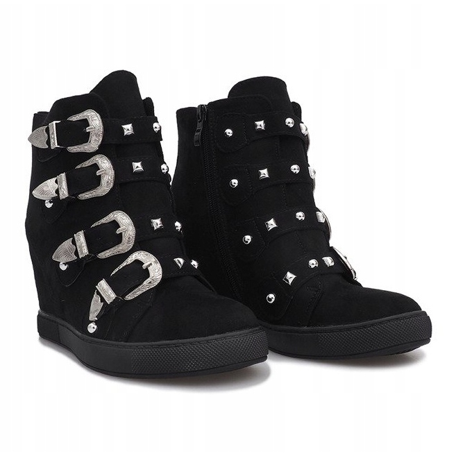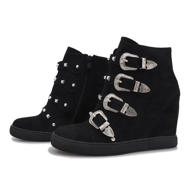Les baskets en daim noir avec boucles Maya sont un choix idéal pour les femmes qui apprécient un look tendance et un confort de port. Ces élégantes chaussures compensées de 8 cm de hauteur allient parfaitement style et confort. La fermeture à glissière et à boucle assure un enfilage facile et un ajustement parfait au pied.