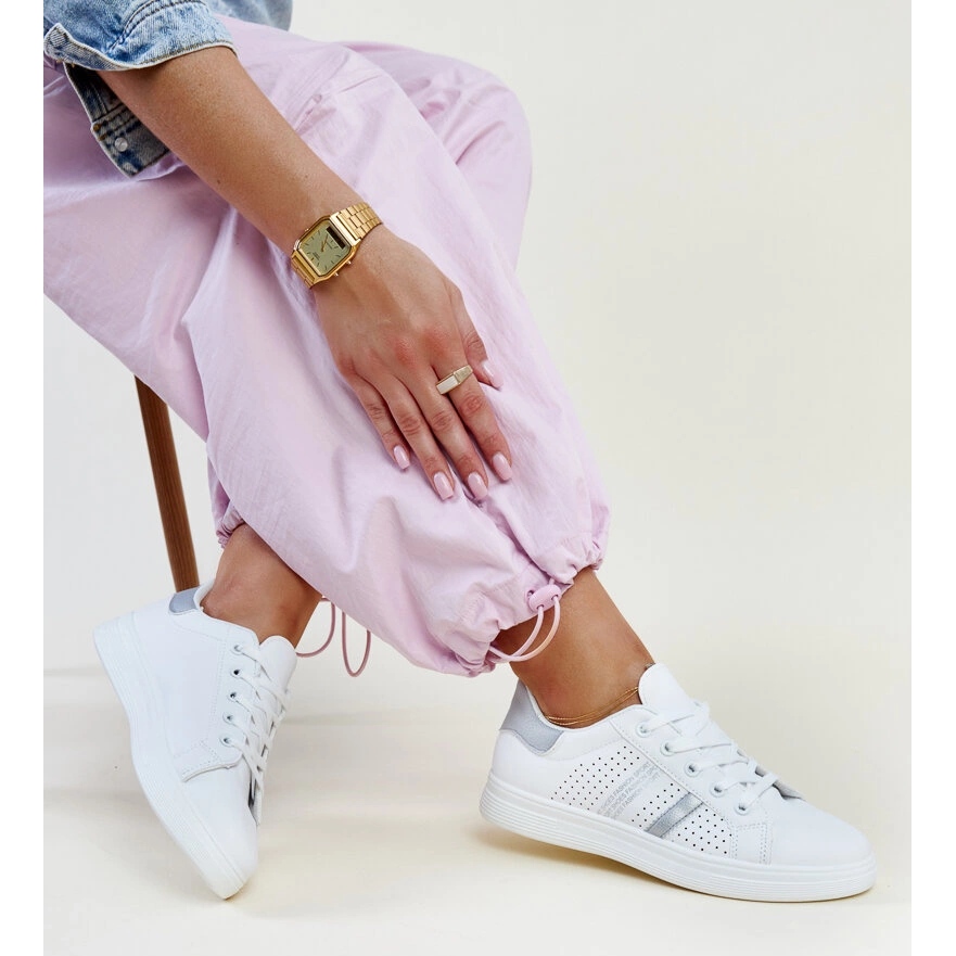 Nous présentons des baskets blanches et argentées de Berdine, qui combinent le style et le confort modernes. Ces chaussures basses en dentelle, en cuir écologique de haute qualité, sont un excellent choix pour toutes les femmes qui veulent avoir l'air à la mode et se sentir à l'aise toute la journée.