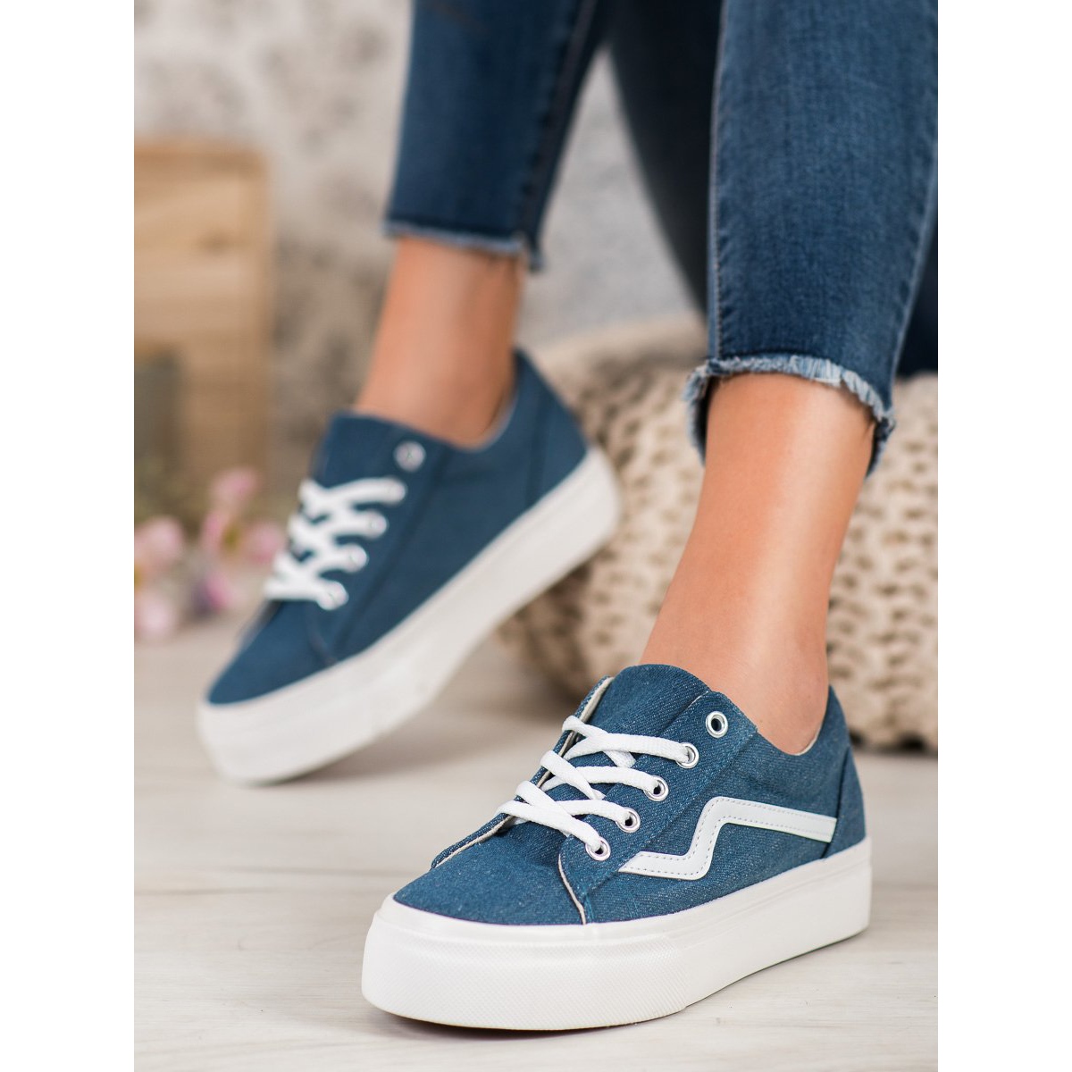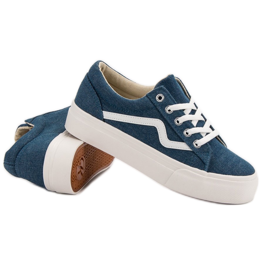 La couleur bleue de ces baskets se marie bien avec différents styles, s'associant parfaitement aussi bien aux pantalons qu'aux robes. Grâce à la semelle en caoutchouc avec bande de roulement, chaque pas sera stable et sûr. L'intérieur doublé en tissu des chaussures garantit le confort et le bout rond ajoute du charme.
