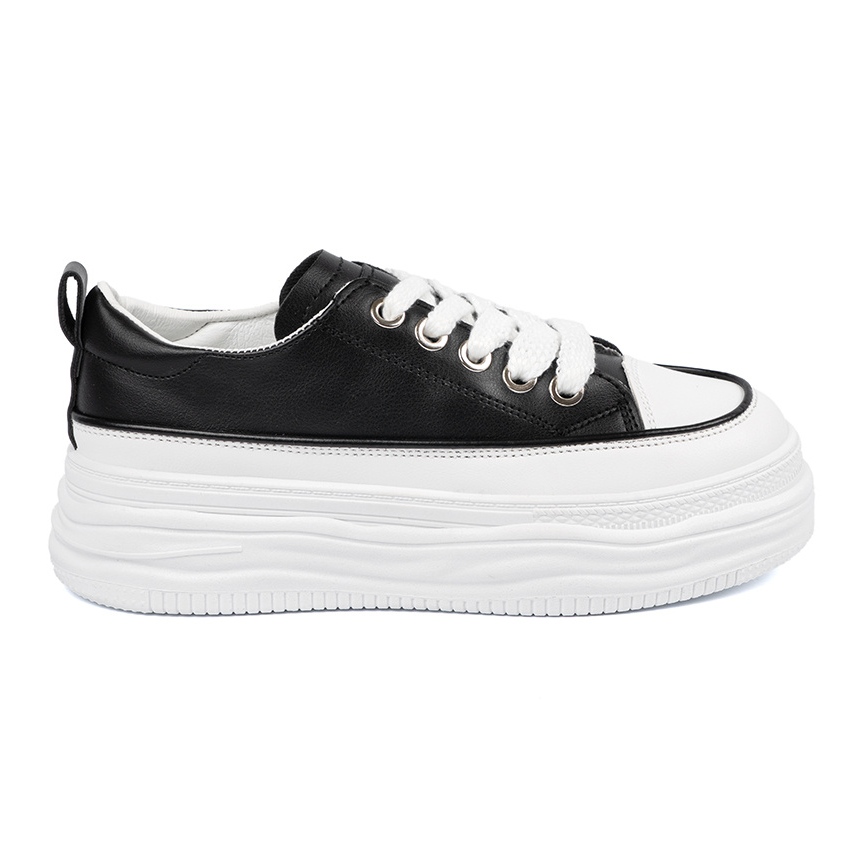 Les baskets se distinguent par une couleur noire classique avec des accents blancs qui leur donnent un look moderne. La plate-forme de 4,5 cm de haut assure un excellent amorti et un confort de porter toute la journée, et grâce au fourrage doux construit et doux, le pied est solidement soutenu. Le nez rond ajoute un charme supplémentaire et rend les baskets non seulement fonctionnelles mais aussi élégantes.